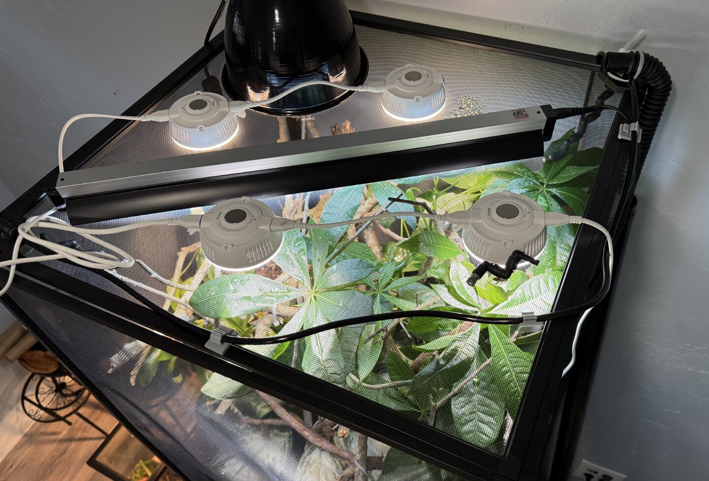 - Lighting - Arcadia Forest 6% t5 UVb, ZooMed Basking bulb 150 Watt - Deep dome fixture Barrina Orbgrow LED plant light pucks x 4. UV and plant lights 7a-7p. Basking was 730a-7p but he never goes under it so I cut it back today to 8a-9a, 1-3p. *Help here*
