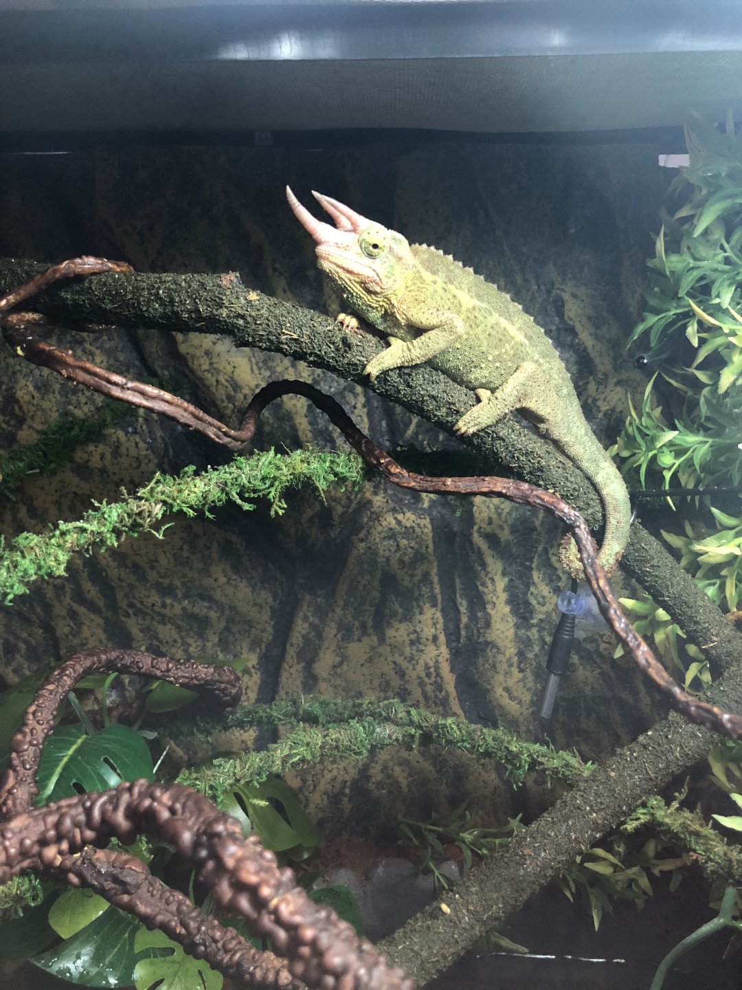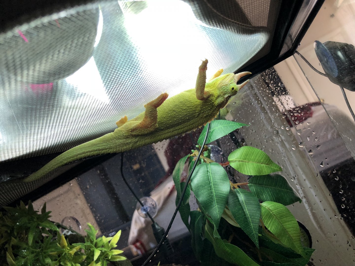 My name is Seattle and I recently bought a fourteen month old Jackson's Chameleon. I had my eye on him for a while and after three weeks of preparation I finally took him home. I have had him for about two and a half weeks. He is roughly 16 weeks old I am so in love with him and I want to do everything I can to make him happy and healthy. I am currently attending college and working on my bachelors degree in chemical engineering. I am home most of the day and I have his enclosure set up next to my desk so I can watch him.