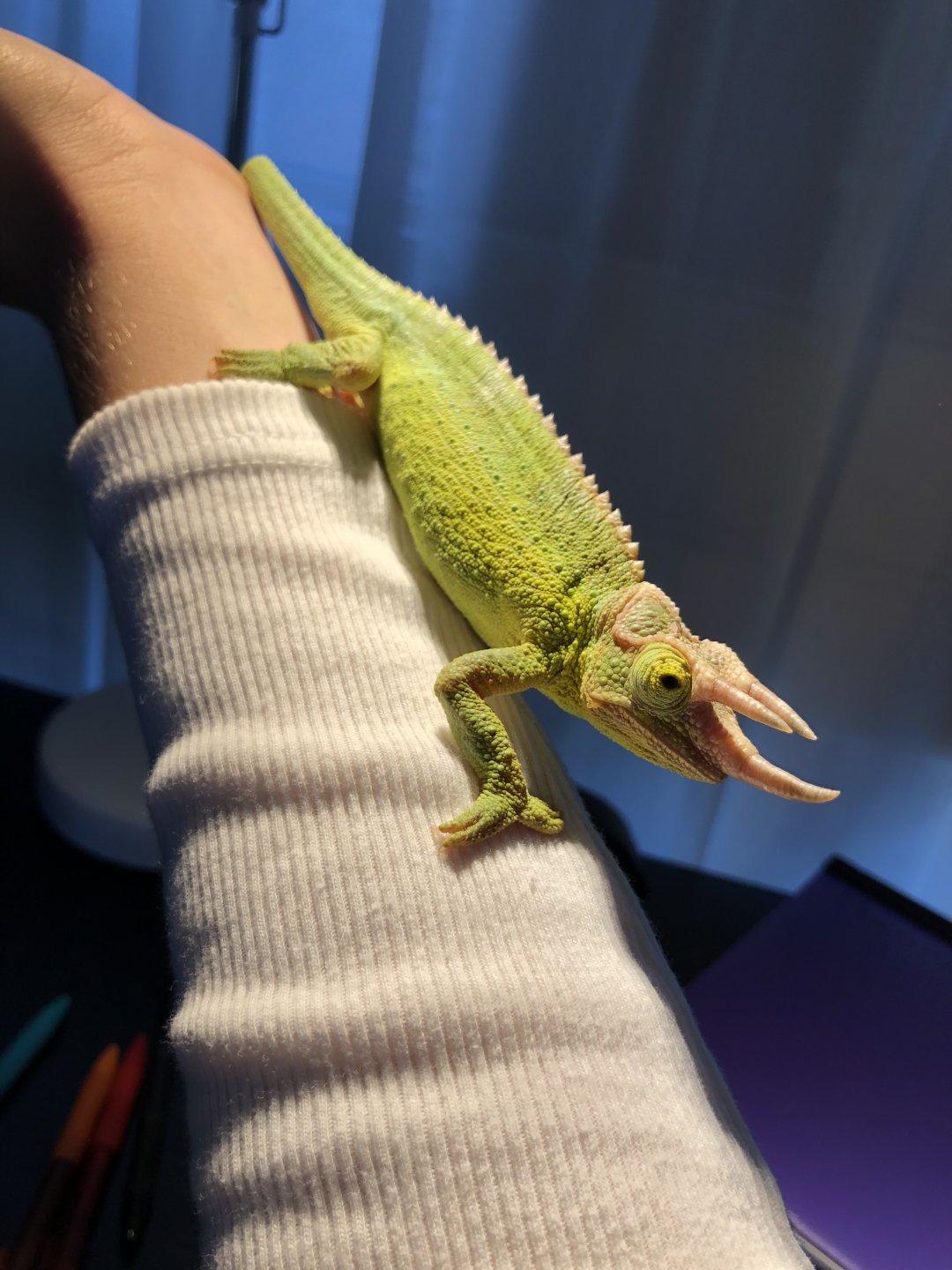 My second concern revolves around his incessant desire to come to me every time I go near the enclosure and ESPECIALLY when I open the enclosure. I never feed him when he comes out nor do I really do anything to or for him outside of the enclosure. However, when I open the door he runs (as fast as chameleons do) to my hand and proceeds to walk up my arm. When he is on me he turns a bright green and usually goes and sits on my shoulder. Often times he falls asleep on me. I have read numerous articles that say it is not good to handle chameleons but I simply can not get into his enclosure without him crawling on me. It is also really hard for me to get him to go back in and once I finally do, he crawls to the side closest to me and scratches on the glass. Could this maybe just be his personality? I don't think his enclosure is too small for him quite yet. I plan of moving him to a larger one terrarium with live plants once he gets a bit bigger.