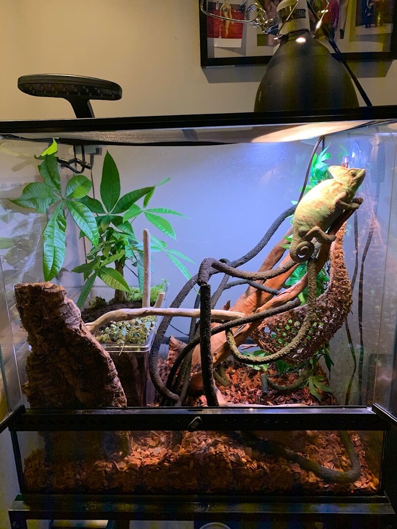 I recently came into possession of a female veiled who was not being taken care of very well. She was in a small glass enclosure with no lay bin, just a coiled UVB bulb, and grossly overfed without the proper calcium/d3/multivitamin routine. I've got her a lay bin (soil+sand with a live non-toxic plant in it) and just yesterday bought her a 2'x2'x4' screen enclosure. I've ziptied the vines I have across the screen to give her horizontal perches, and I put a foam "wall" (you can see at the bottom of the picture) to give her lay bin privacy, but the floor is bare besides that. I was just hoping for some insight on how to make her enclosure better. I've got a digital thermometer/humidity reader, a linear UVB bulb, a heat lamp and a coiled UVB bulb pointing at the same perch, a mister and a fogger. The next project I was planning is to cut a drain in the bottom of her enclosure.