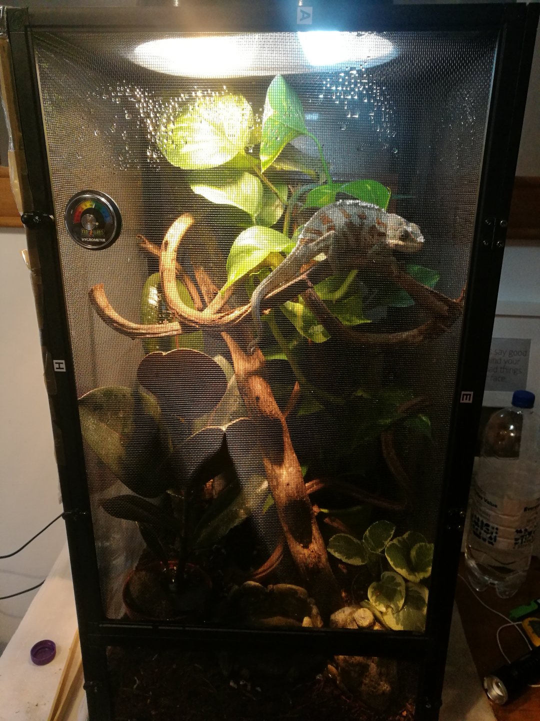 4. Misting, im manually misting, the humidity meter ive got says the cage is always on moderate. When I mist it, it goes up to humid but when it dried out it drops back down to middle moderate. But this means im misting 4/5 times a day and Reko always licks the leaves for at least five minutes when ive misted. So I read that u should cover two sides with plastic to help retain the humidity, which I did and its kept it up a little bit.but not much. Any advice about this or should I switch to glass viv??