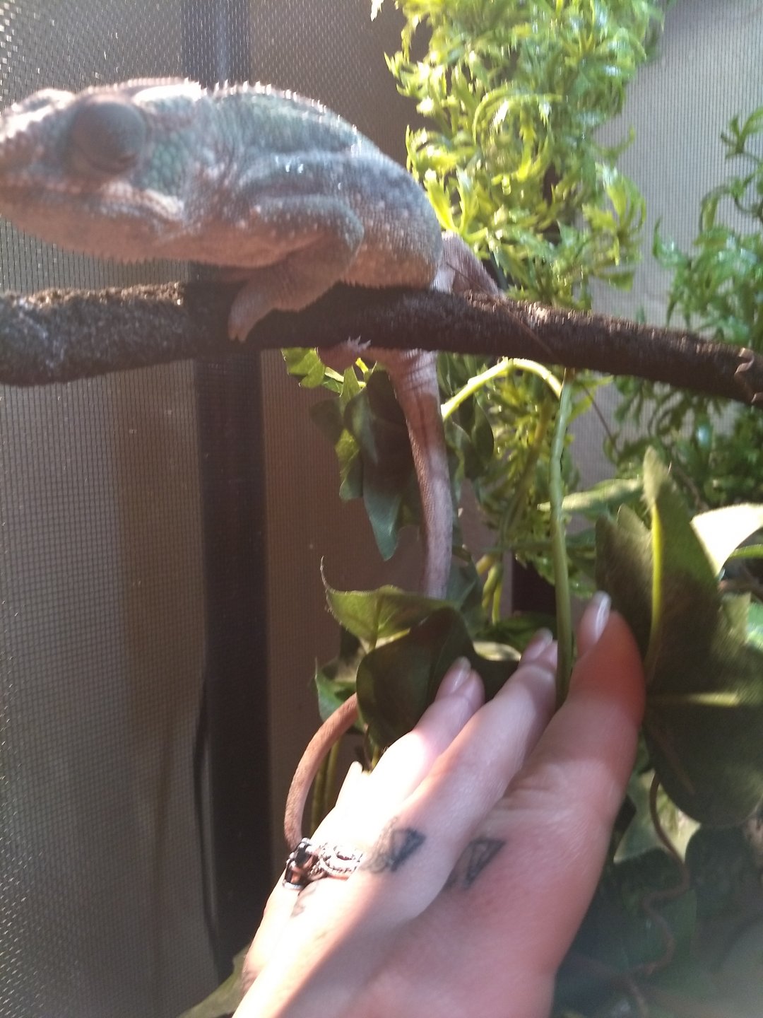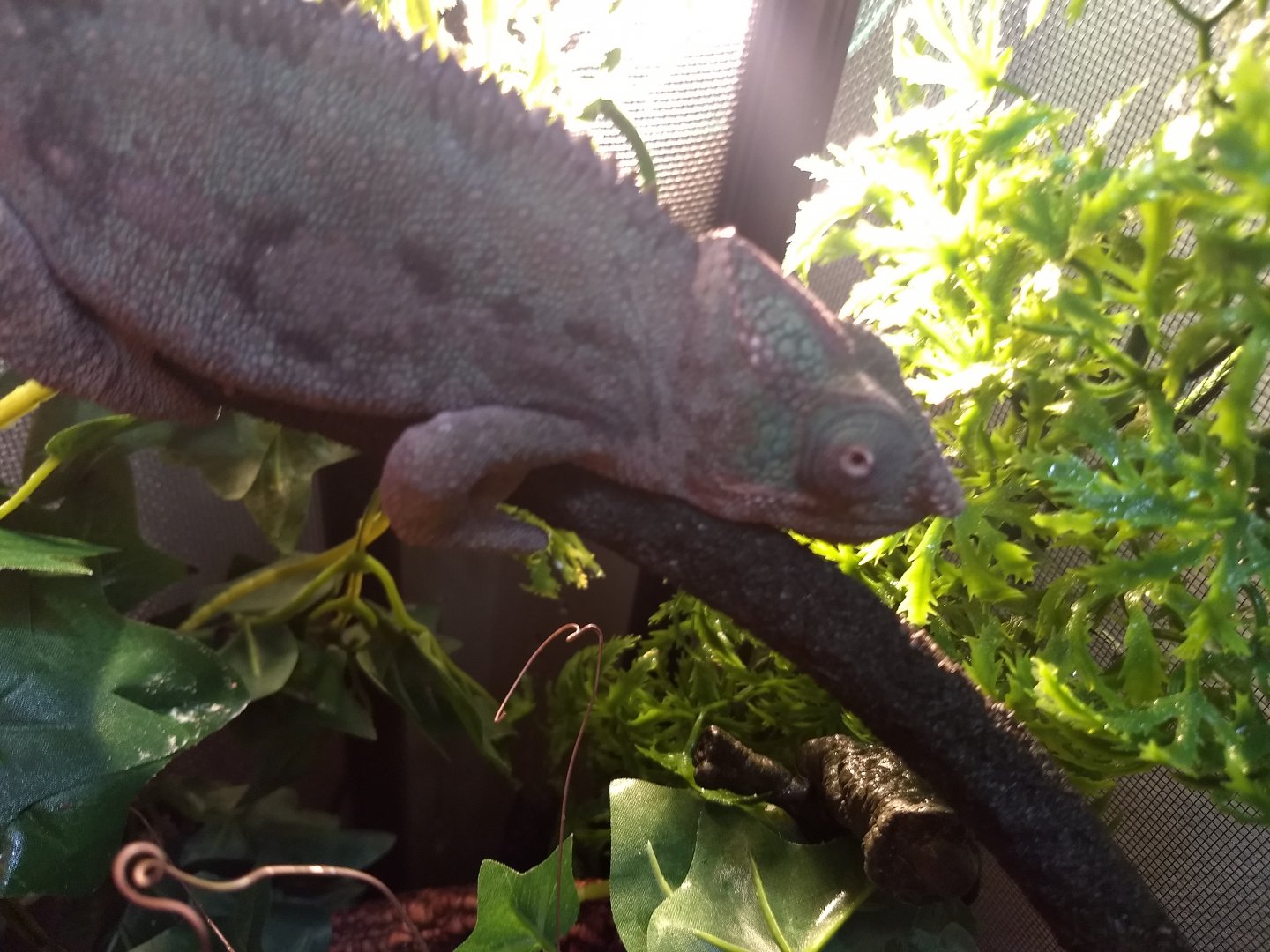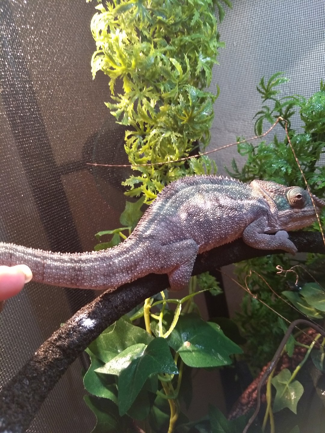 - Your Chameleon - panther chammie, I'm pretty sure he's male, he pooped and had that red butt tube that went back in. I think he's older. He's pretty big.