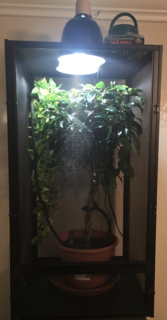 - Lighting - What brand, model, and types of lighting are you using? What is your daily lighting schedule? It came with a Zoo Med Light. Its a mini combo deep dome lamp fixture. I have a Daylight Blue Reptile Blub ( 60 watt ) and Reptisun 5.0 mini compact fluorescent ( 13 watt ). Pascal's light is on from 7am to 7 pm. Its centered on top of the enclosure. He likes to bask on top of his Ficus. I made sure to trim it so its 6-7 inches under the light. At night he sleeps in the lower branches of his Ficus.