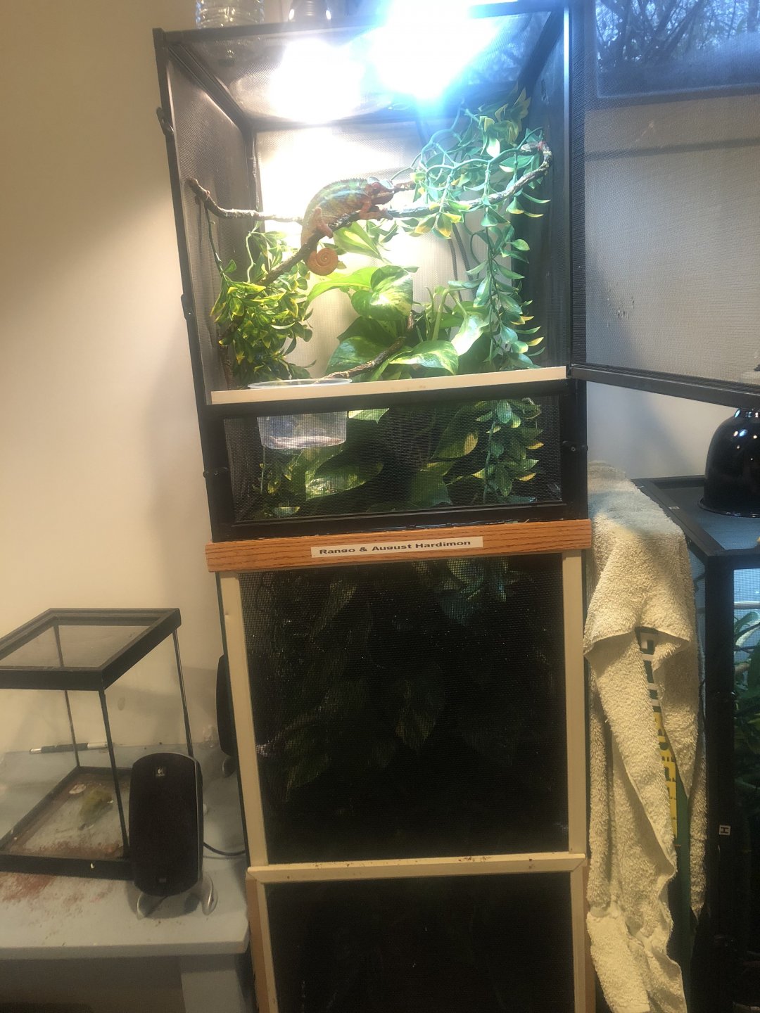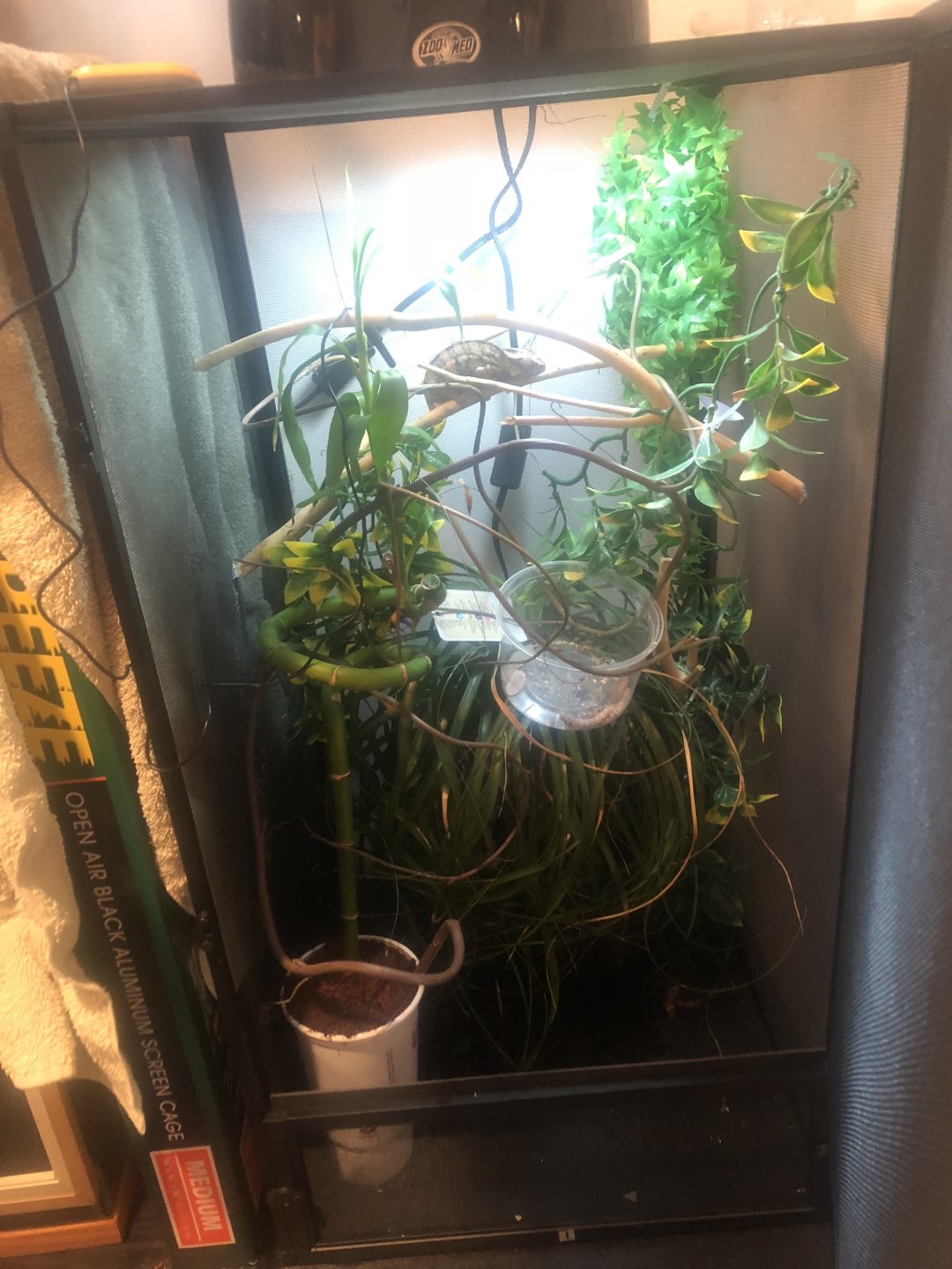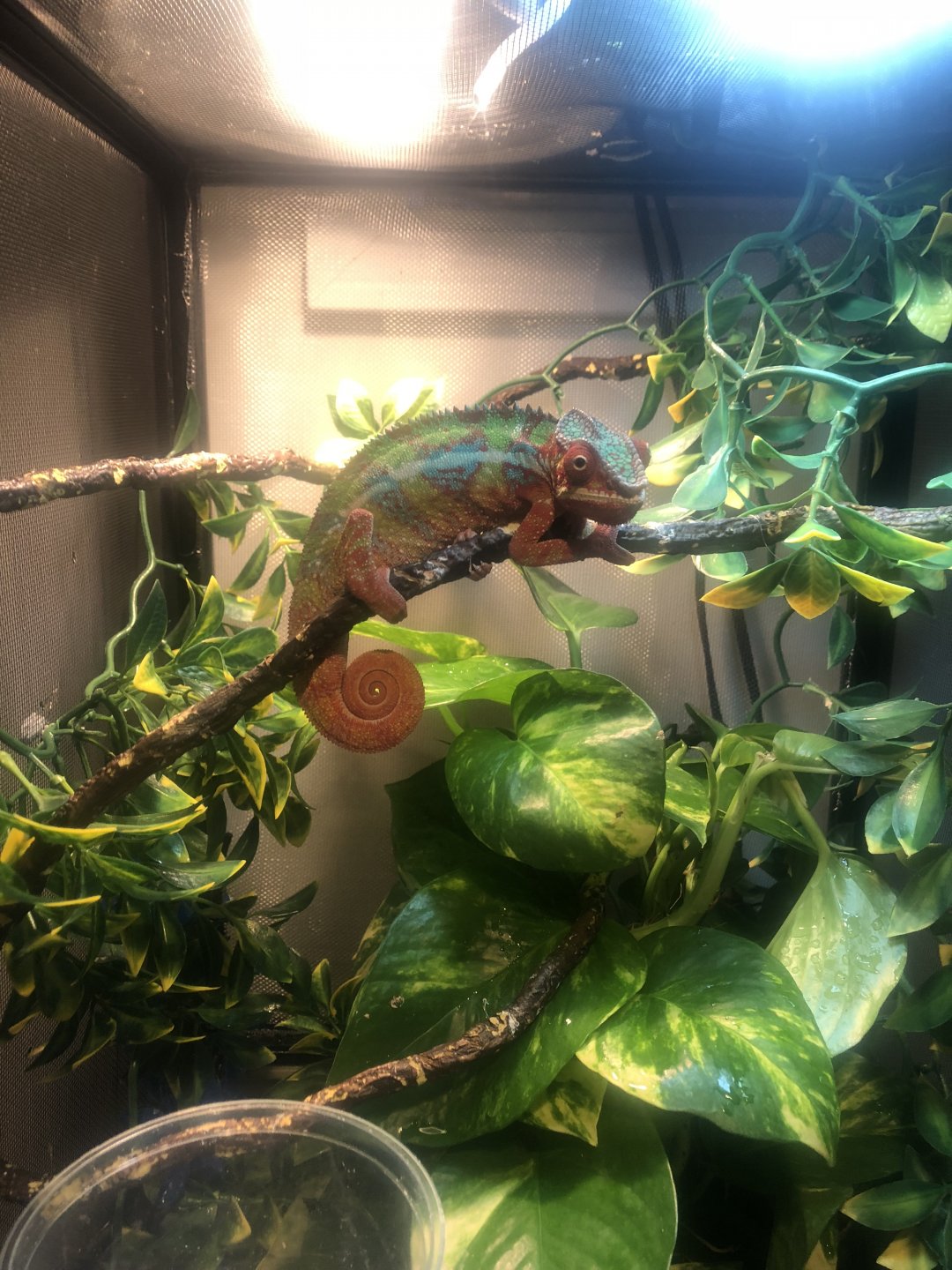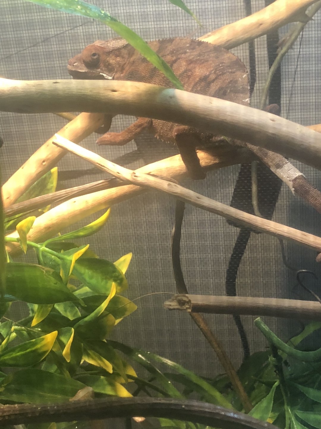 so I recently got the opportunity to get a pair of panthers for my birthday this past Sunday! I’ve had experience with some chameleons here and there but never got a panther. I received a male and female that were both housed in a singular cage and both approx 9 months old. The guy I received them from had them for about 4 or 5 months. I got them home, I set up two separate cages and added live plants to what he already had. Here’s what I got, let me know if any issues.