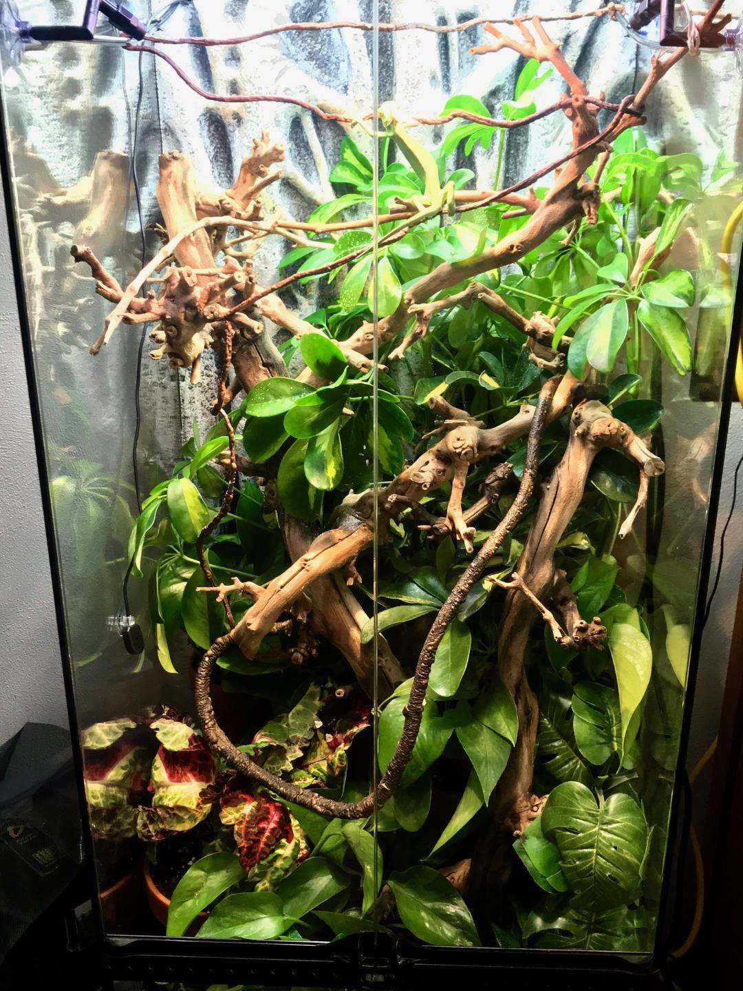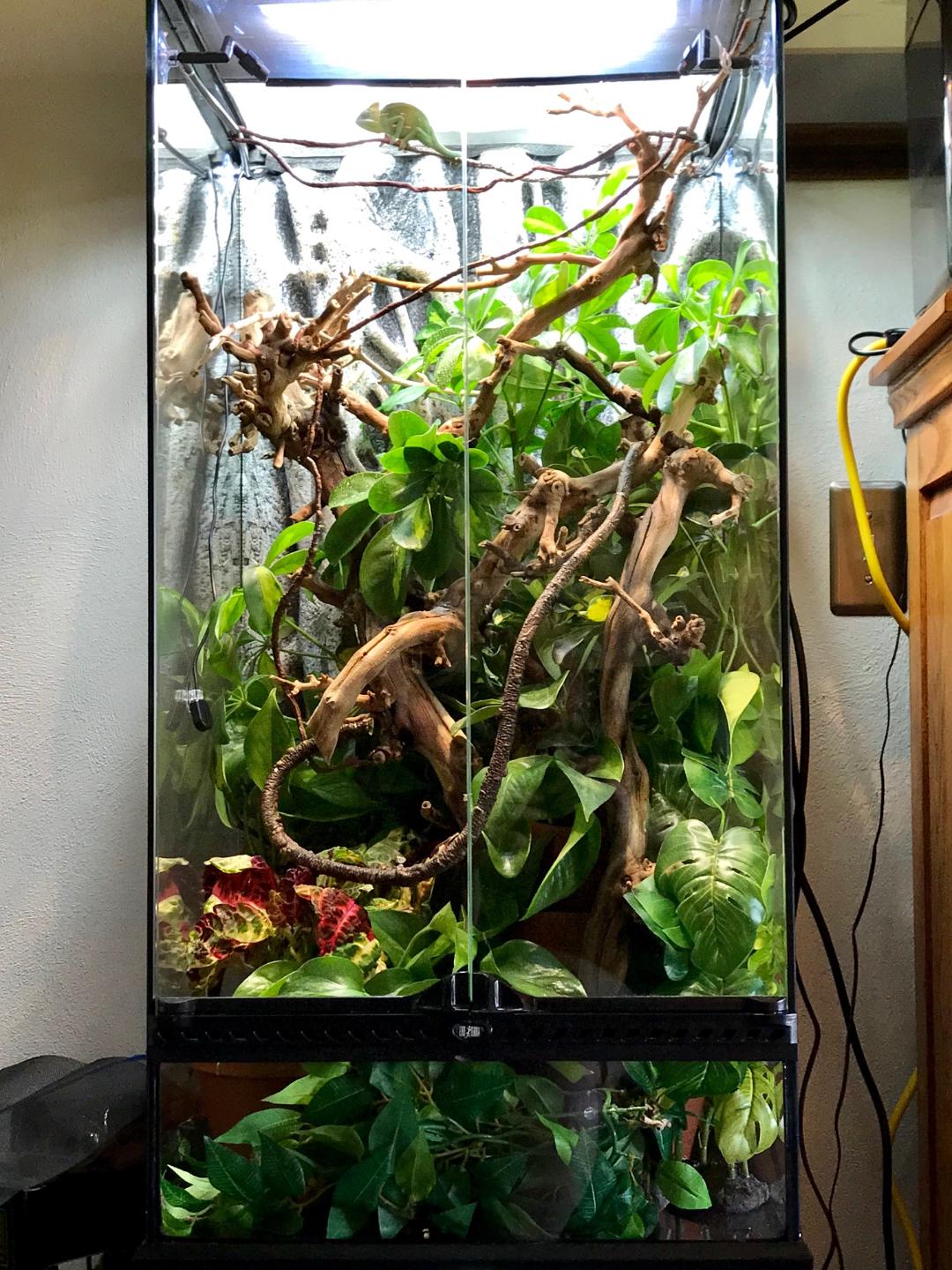 His terrarium is set up with a Monsoon mister. Lights are the Exo Terra Duo Top with one 5.0 t8 and a ZooMed Sunglo natural light t8 and 35w halogen for basking. There is also a Exo Terra Dual Canopy with two 26w 6400K grow lights. This is why I wish I would have gotten something larger for better light selection.