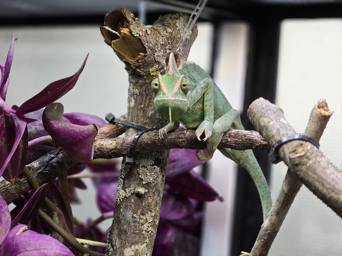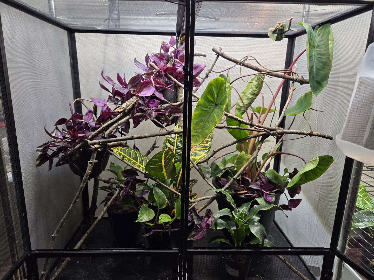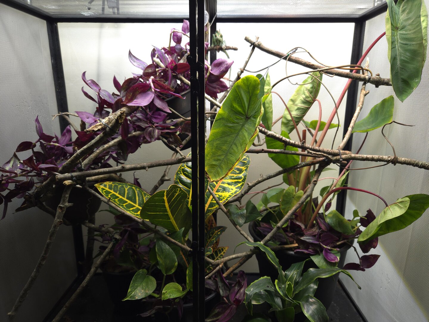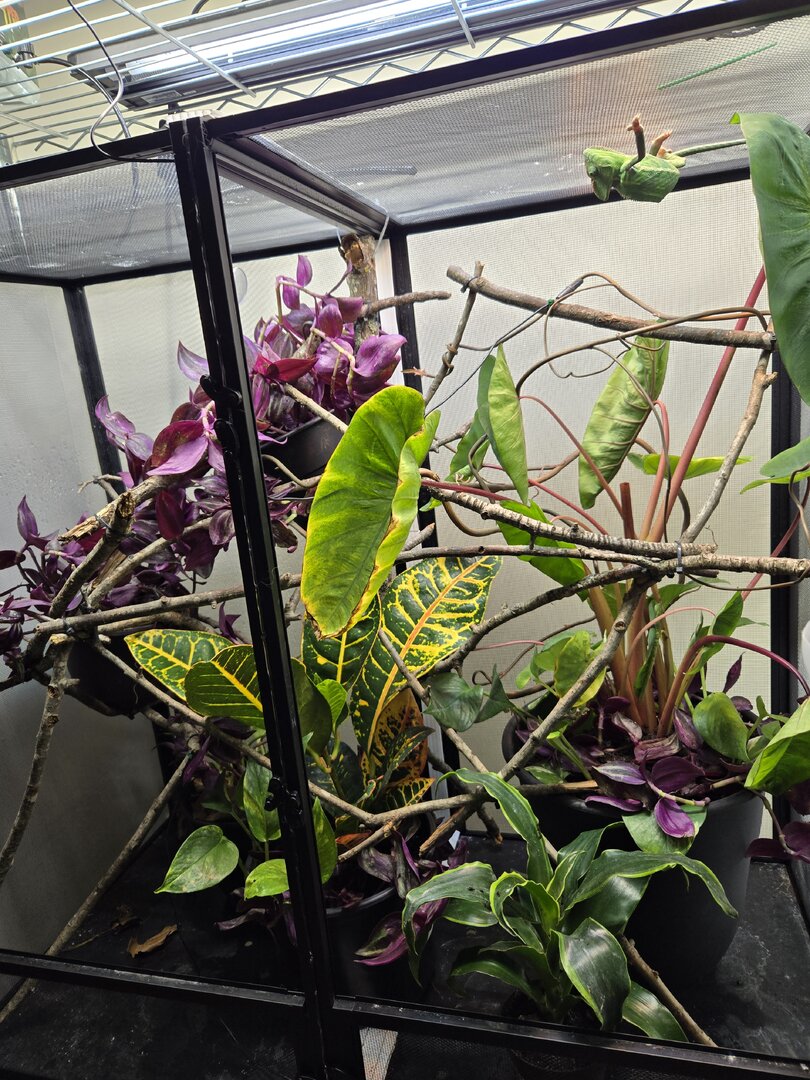 I found a few lovely plants recently for a really good price: a rather full pot of tradescantia, some type of colocasia, and a bucket with 3 sizable croton plants! I only have one in Pepper's cage, the other two I potted and left under my other grow lights. It's a bit of a tight squeeze