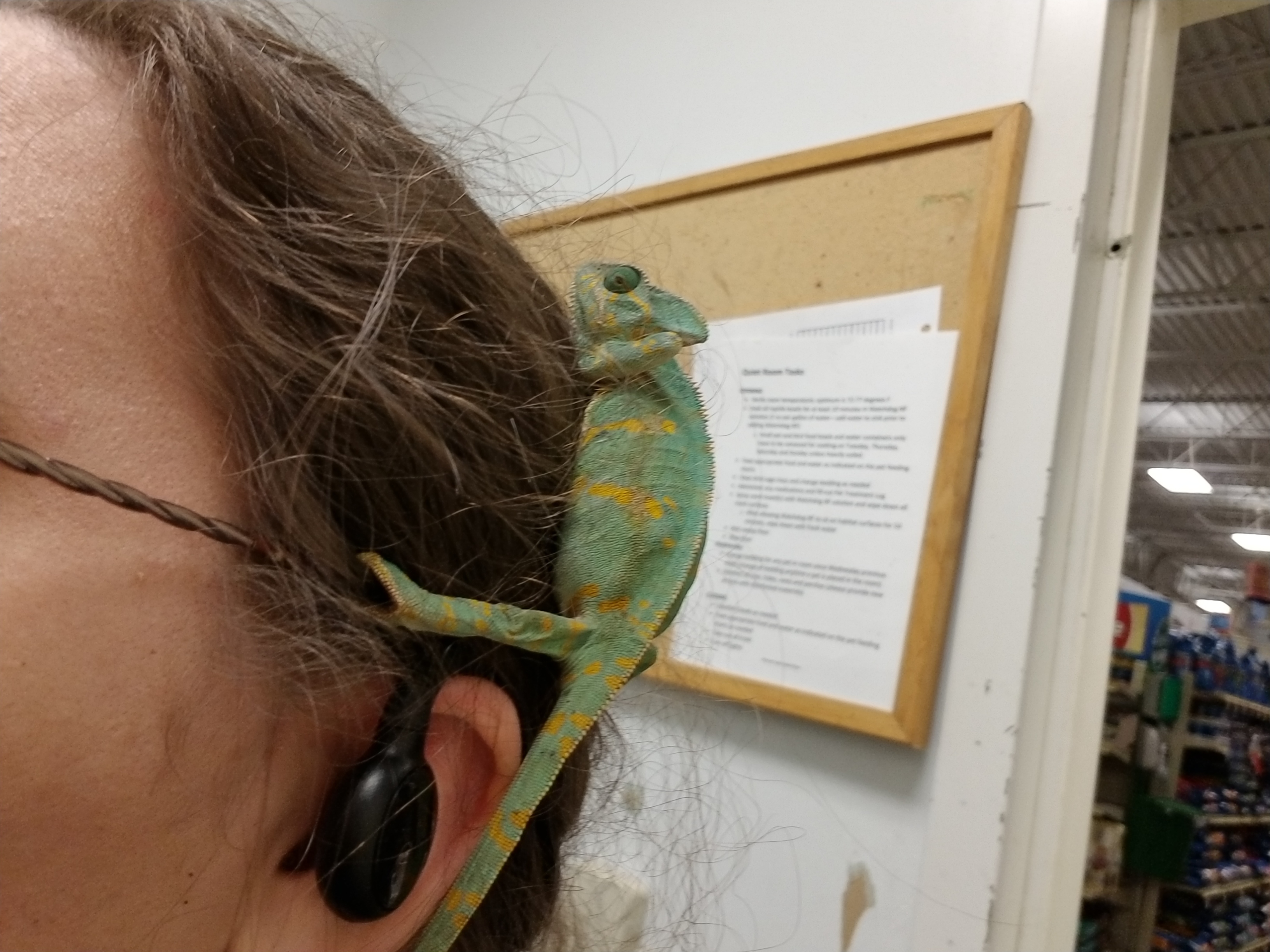 Her name is Kodak and I have no idea how old she is I just know she is much larger then the Chameleons we normally get in (which usually seems to indicate the breeders knew there was something wrong with her. It's becoming a pattern with the older reptiles we get.) She'd also gravid and trying to dig her tunnel and lay as we speak.