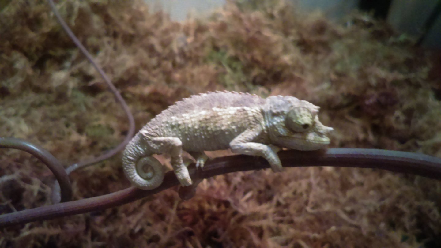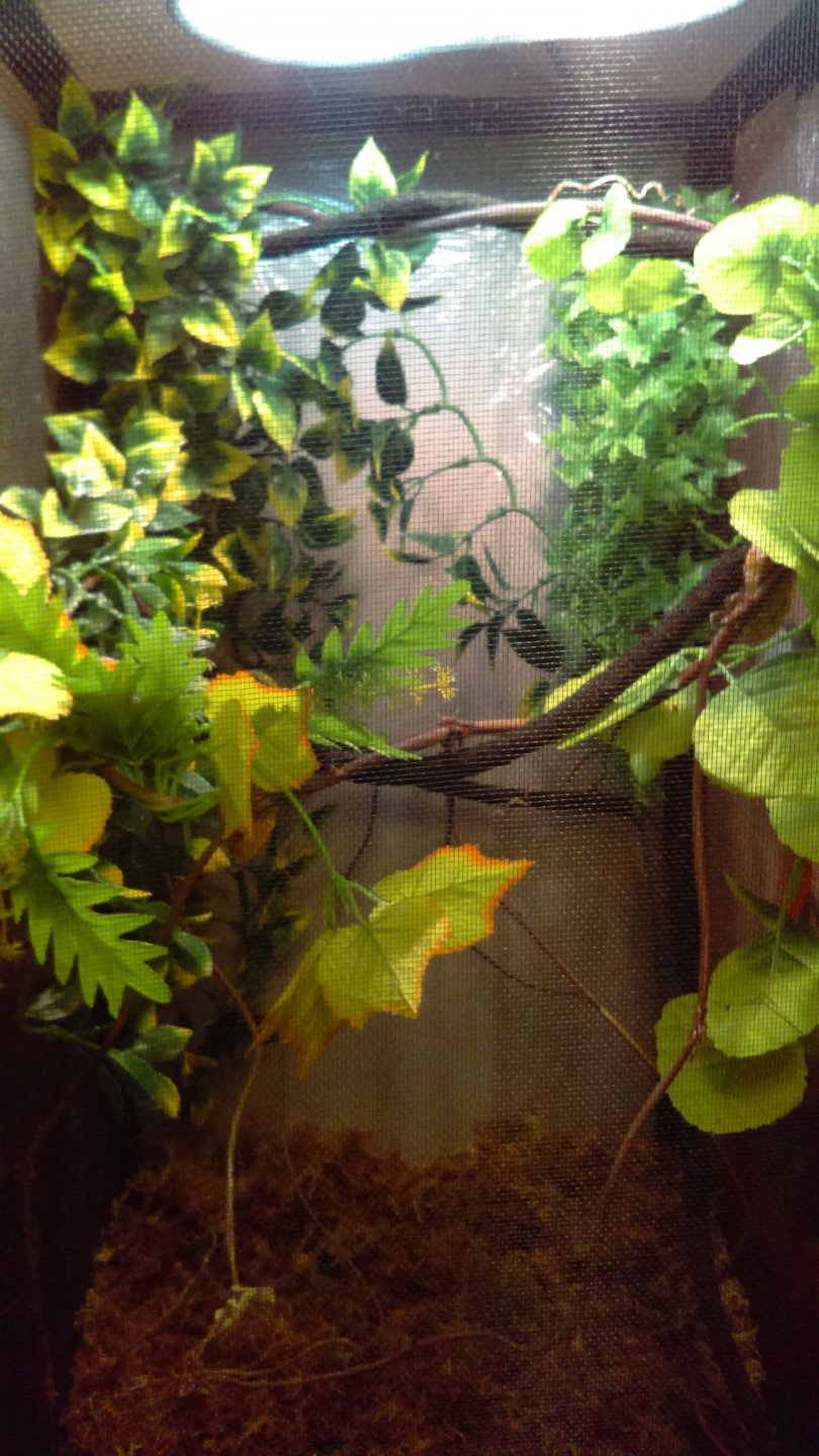 I have recently obtained two male Jackson's Chameleons.. Here's the scoop: They were born August 30th and are still fairly small (about two inches nose to vent).. both changed from black/dark brown to green within a few days of me bringing them home, and are eating very well (fruit flies and small pinhead crickets that are gut loaded with endive and collard greens, and dusted with reptivite once a week) their lights are 12 on 12 off with a 60w heat and a UVB bulb. temp ranges from 77* at the highest perch to about 60-62 at the lowest point, staying around 60 at night.I use two digital thermometers to measure one at the top and one at the bottom. They get misted twice a day and fed mornings, and also have a drip system. Enclosure humidity stays around 70-78% on this schedule. They are still being housed together as I hope to rehome one assuming they make it. Neither has seen a vet as I live in a very rural area and do not have a reptile specialist here.. although I plan to move to Colorado from Northern Nevada in the next few months and will be using CSU VTH. Both are producing healthy looking feces/urates from what I can tell. I have only handled them maybe three times since bringing them home, as they had a very stressful first two months of life in a fully enclosed 5 gallon aquarium that was too hot( 80-90*F) with 24 hour lighting placed directly on a wire top..and not humid enough. (Misted once a day, that's all)One of the two I have become particularly fond of because he was burned by the lighting in his previous situation and lost about 1-2cm of the end of his tail. (I monitored it about a week because it was darkened until it came off, which is why I suspect a burn.. he is now using his remaining tail with no apparent lameness or sensitivity) I am reaching out because I obtained these guys unexpectedly, but after finding out that 8 of 10 babies had passed within a month I couldn't help but take them in. (I have a soft spot for reptiles that have been neglected/abused) I have experience with snakes and bearded dragons, at home and have alot of experience in animal welfare and general animal care in a rescue setting. I can't say I was fully prepared to take these guys on, but I am eager to do right by them! I have read up quite a bit on them but I know sometimes explaining the set up and situation to more experienced owners might enable me to receive pointers and constructive criticism, which is actually why I joined this forum. I've only had them about a month. I really want to add more foliage because what I have now is plastic and aquatic silk, with a layer of sphagnum moss under mesh to hold humidity but prevent possible digestion/impacting. I would prefer live plants but have been struggling on where to find the right ones, and what those are? Please tell me if I am starting off on the right foot, as this is a learning experience for me! what can I do differently? Any advice and input is so greatly appreciated! 1512272670239195630954.jpg