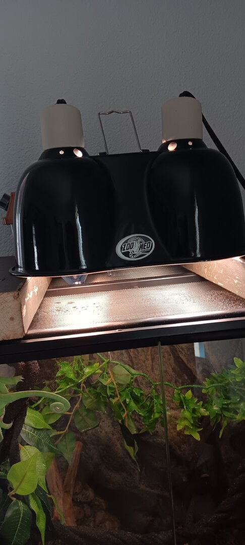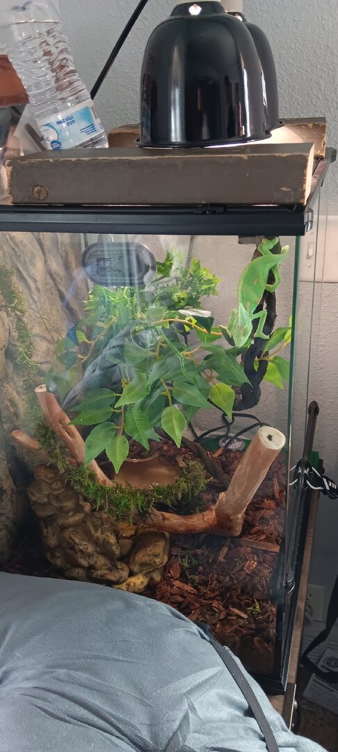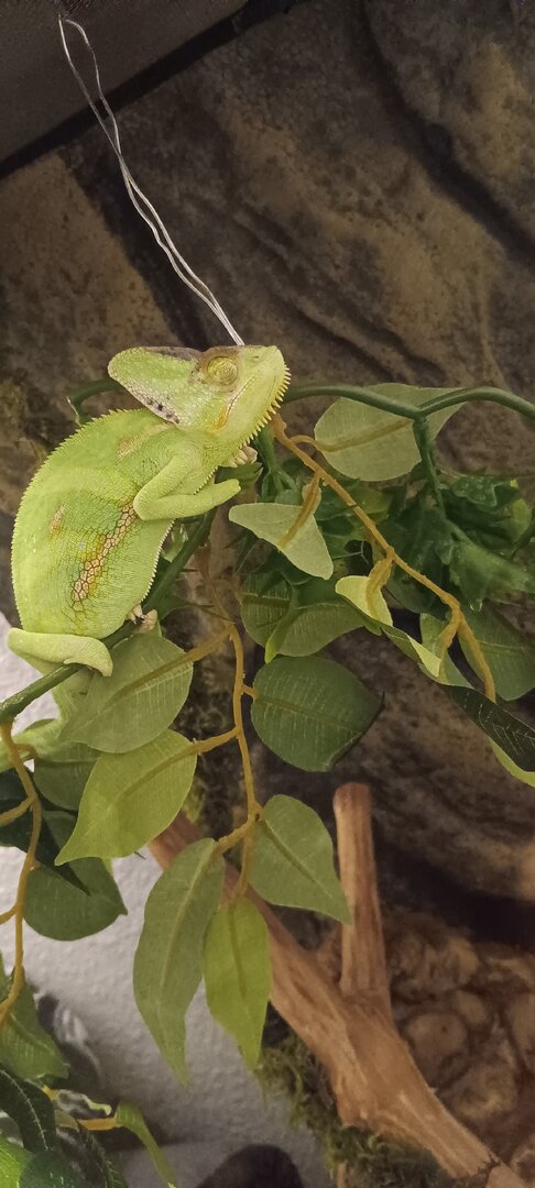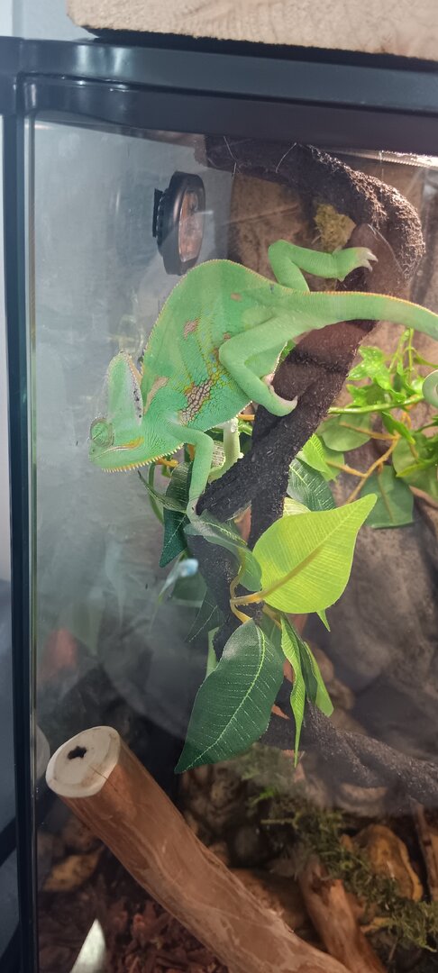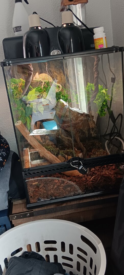 So I just got a vieled about 5 days ago just wondering what advice I can get about cage set up and everything also last night his head turned black and he hasn't opened his eyes all day today unless I open the cage and get close to him but here pictures of his enclosure I am removing substrate today and buying real plants to put in there my lighting is a zoomed blue day bulb and a 5.o uvb bulb I've been feeding him medium sized crickets about 10 a day
