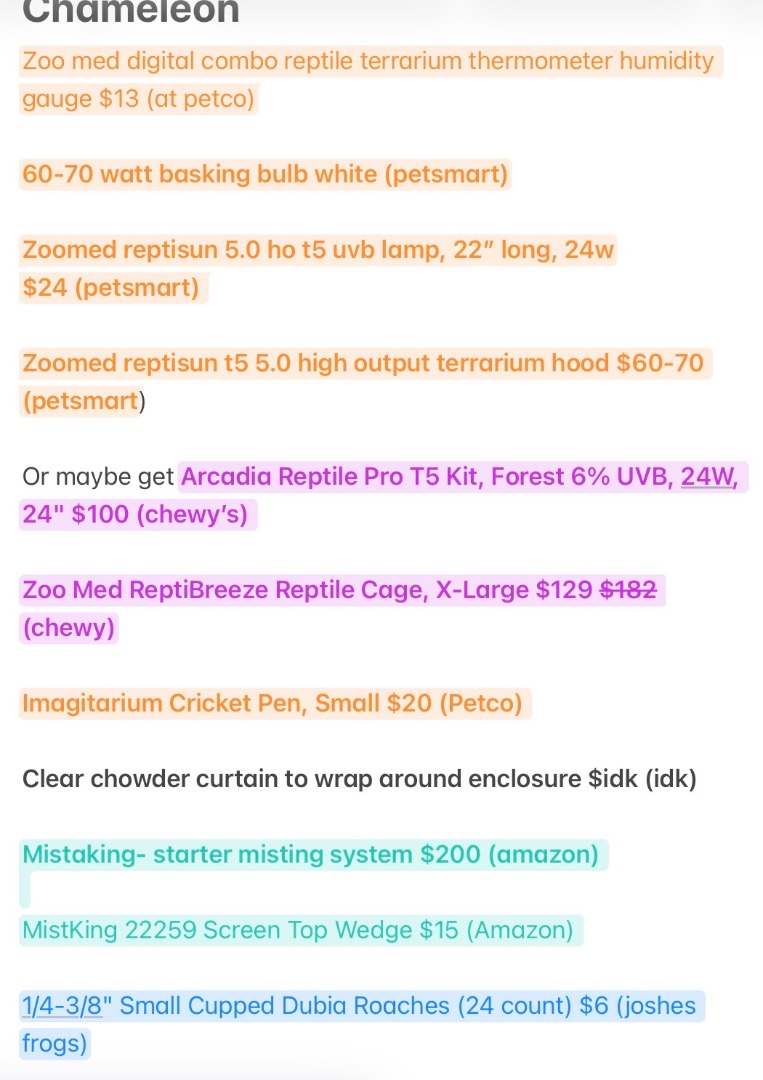 Hi and welcome! There’s not really anything more I can add to what has already been said. 🙂 I see your list though and wanted to let you know that there are some wonderful options to buying a good chameleon kit. Neptune has partnered with Pangea and has a couple of kits. https://www.pangeareptile.com/colle...tarter-chameleon-kit-by-neptune-the-chameleon Fram’s Chams also has a few different kits. https://framschams.com/collections/...ucts/size-24-24x24x48-essential-chameleon-kit They also happen to be one of the best breeders to buy from. AFAIK, they are also possibly the only breeder with a solid reputation who breeds veileds. For other awesome breeders, do check the sponsors. https://www.chameleonforums.com/sponsors/?tag=chameleons I haven’t visited them all in a minute, so they may have expanded into kits too. You’ll have to check. ;)