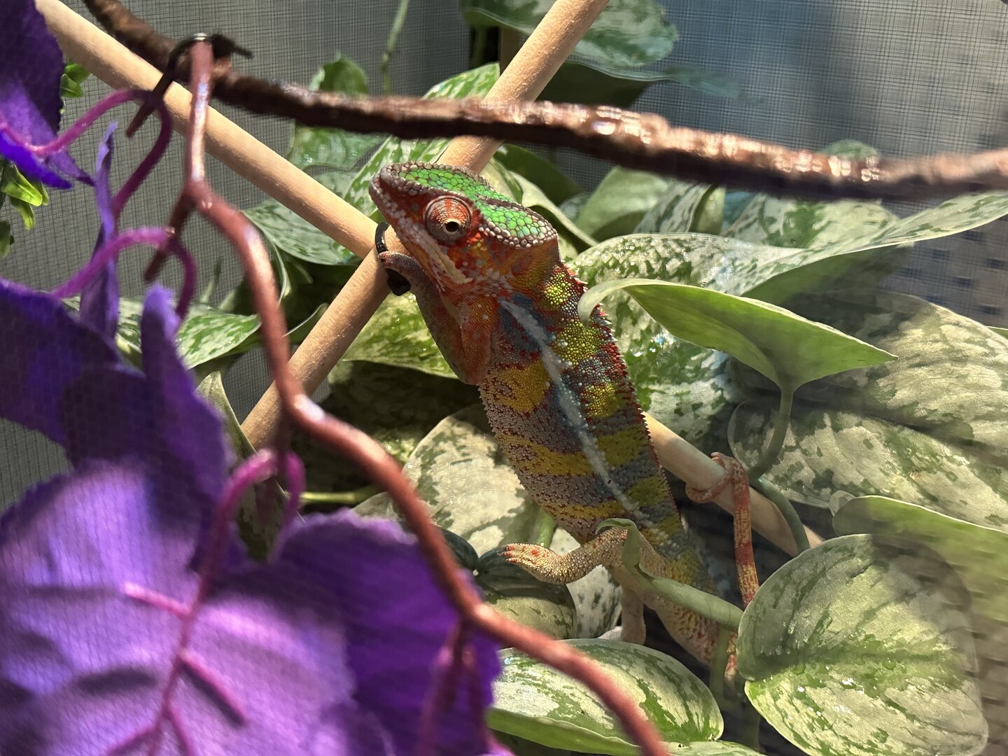 • I have an elephant ear and what I think is a philodendron that he loves to sleep in each night. This is a great start, most likely you will need many more plants, especially as you upgrade to the correct enclosure size. Pothos are also great if you can find those. I'll attach a document with other safe chameleon plants for you to view. Chameleons often hide in their leaves, this helps them feel safe so making sure you have enough places for him to hide in is good. A good rule of thumb is if you can look in your enclosure and instantly spot your chameleon you do not have enough coverage. Attaching a pic of one of my enclosures for you to get an idea of what you will need for him.
