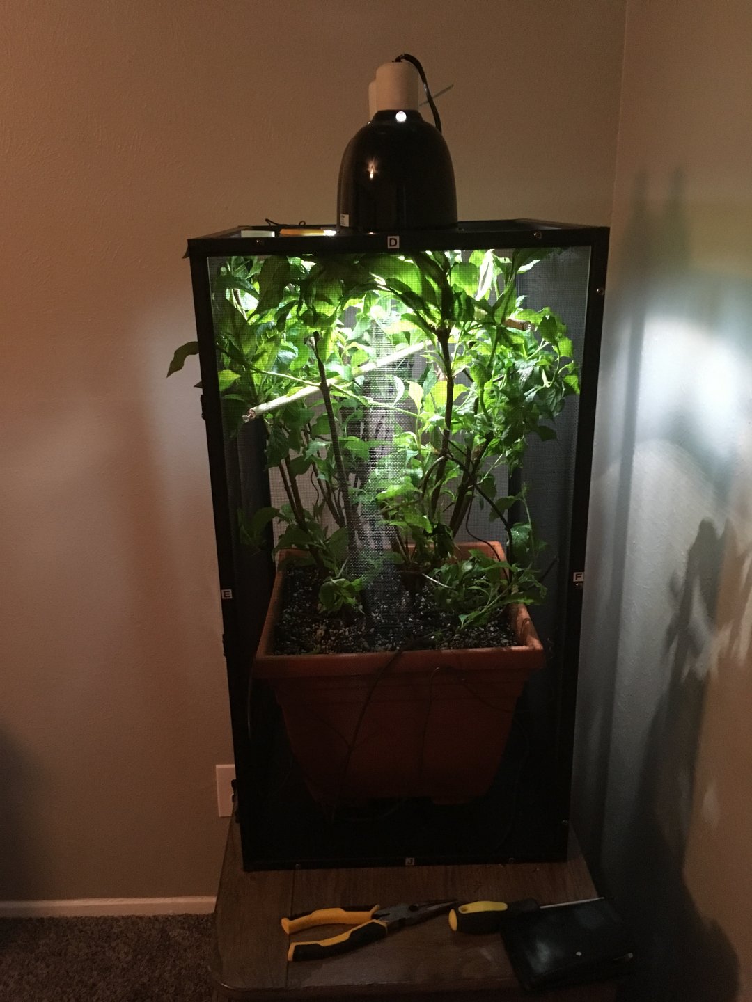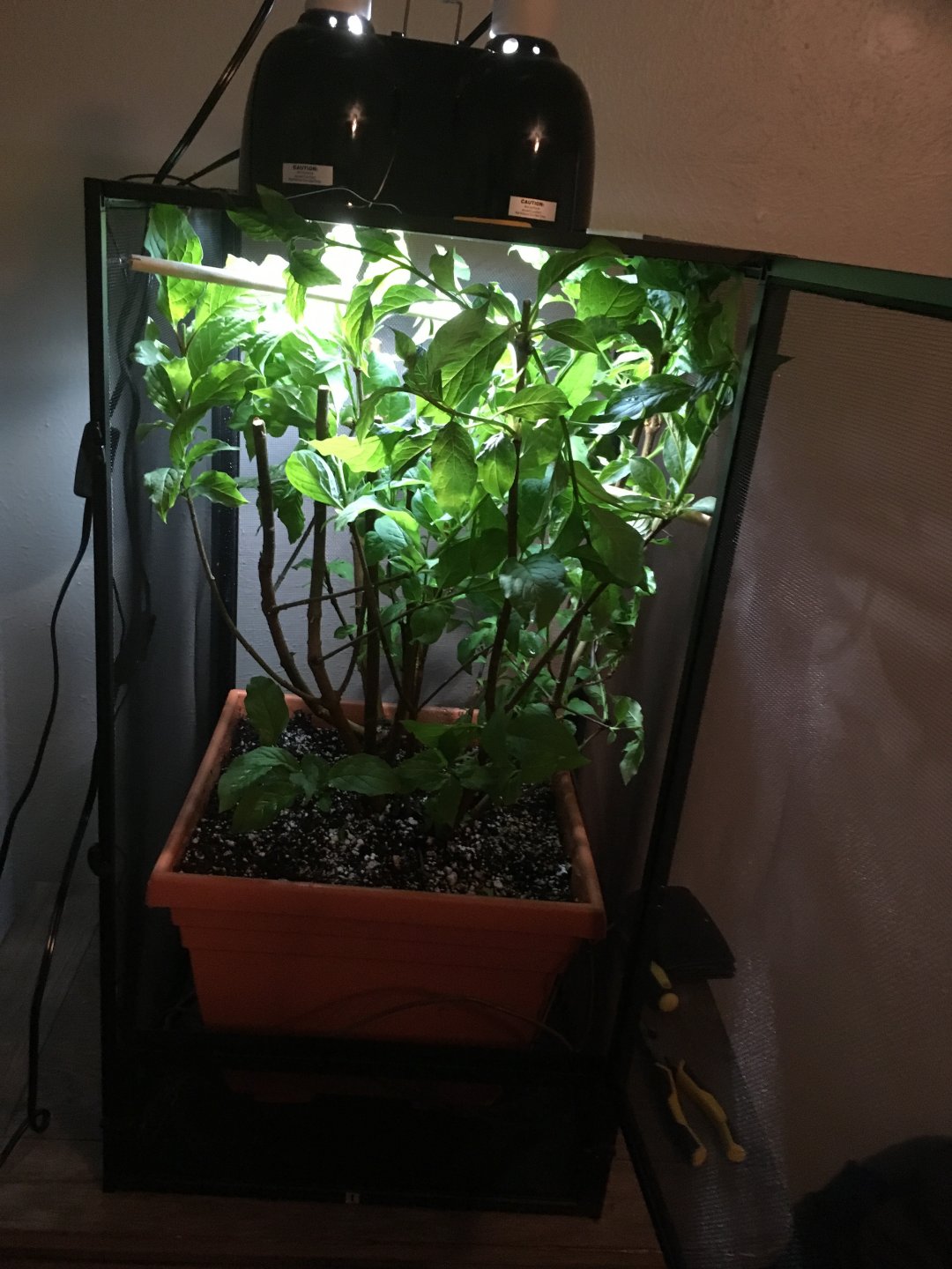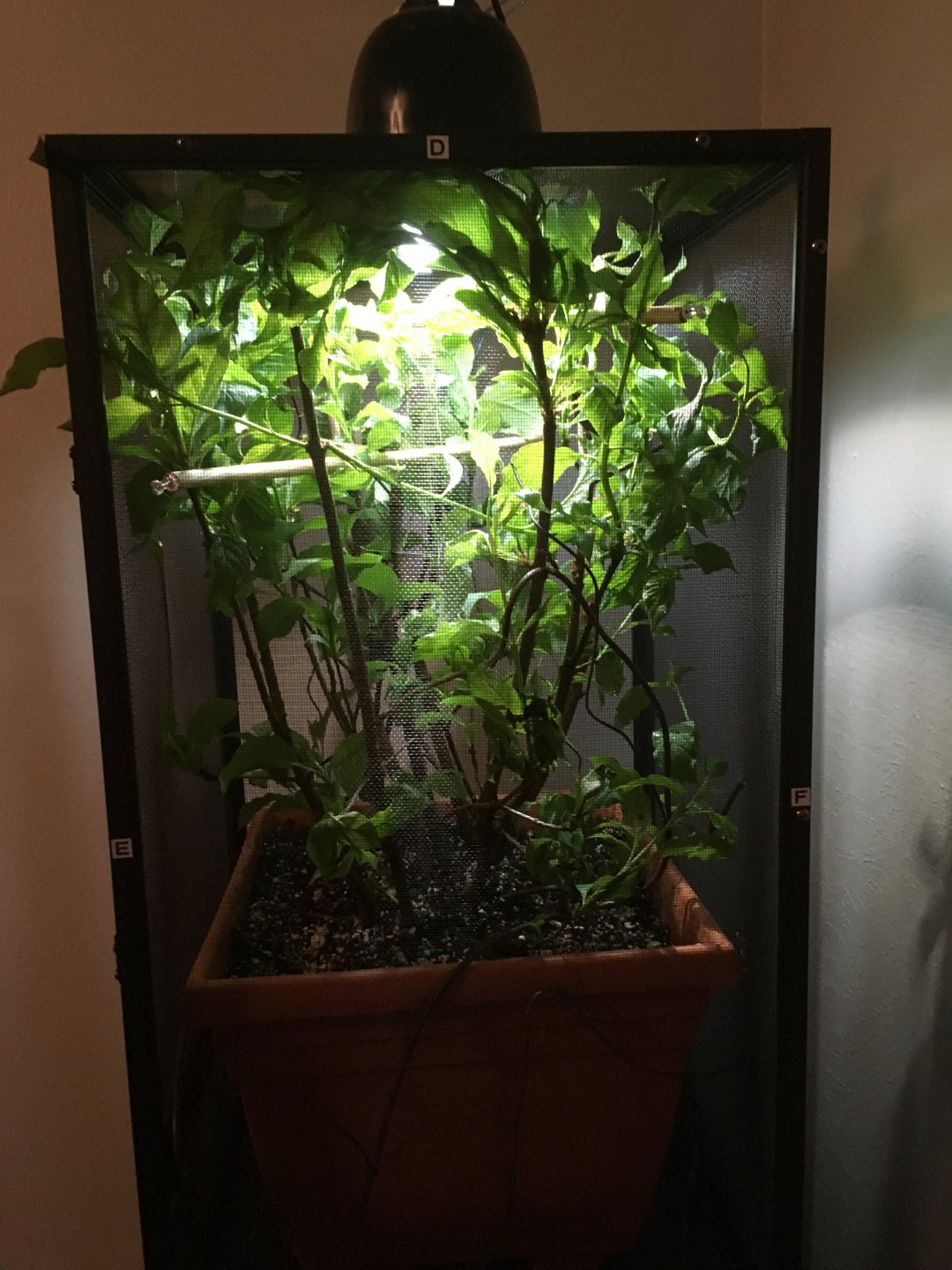 First off I purchased a Lilac shrub for my little cage. I cut it down so It would fit and I think its looking great. I was hoping someone can tell me if it needs work. I also am a little puzzled because he is so small he can't eat crickets, but fruit flies go to quick. I don't want the little guy to go hungry. Any tips and tricks on my setup or little guy would be appreciated.