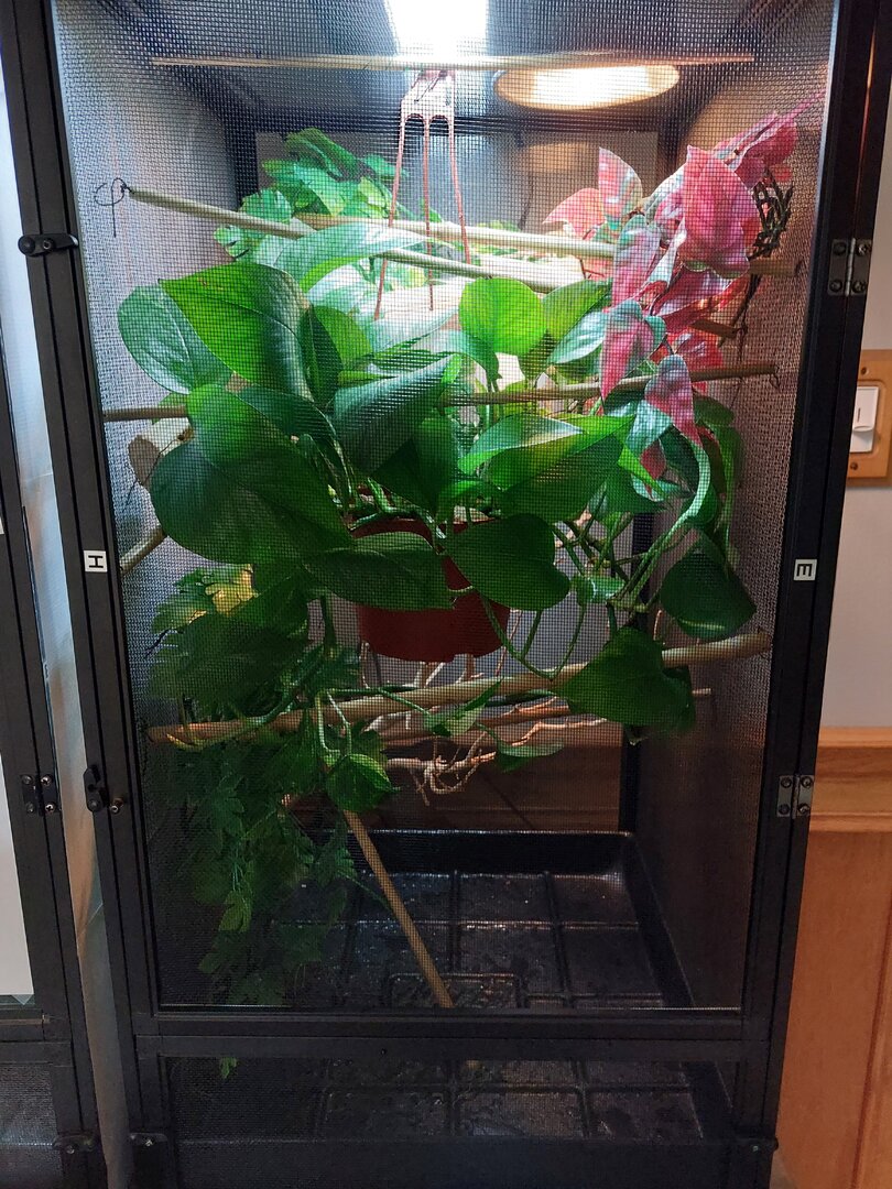 Also I have a transplanted pothos in there. With a few pieces of perlite from organic potting soil mix. Should I be concerned of him eating this perlite? Thinking with him being so little. I took my other plant out that needs a little work. Took a photo of his setup. Just a temporary smaller cage until he gets huge. Like my other veiled.