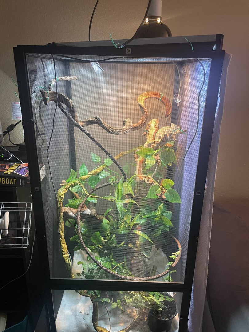 • Just today I completely reorganized and switched everything around in his cage. I was worried about doing to much to soon and stressing him out even more while he was still getting accustomed but decided it would be better to make sure the enclosure was better first. I had a lot of fake leaves and other vines and sticks, while providing hiding spots and water collection it felt like I was robbing him of greater health and enjoyment when I could easily fix everything. As of today I took everything out and the enclosure is now just sticks/branches for climbing and basking, two fake vines so that there is better maneuverability around and to keep things in place, one large ficus and one large dracea, a smaller for shrubby ficus that he has enjoyed eating, and one shoot of bamboo in the back that I got for free.