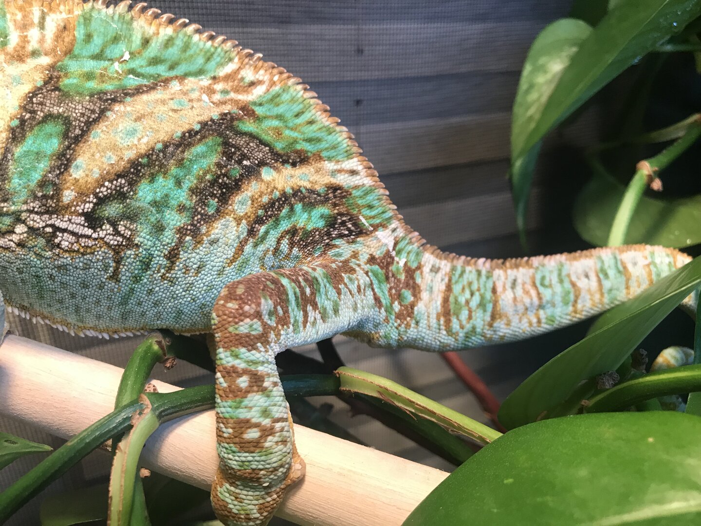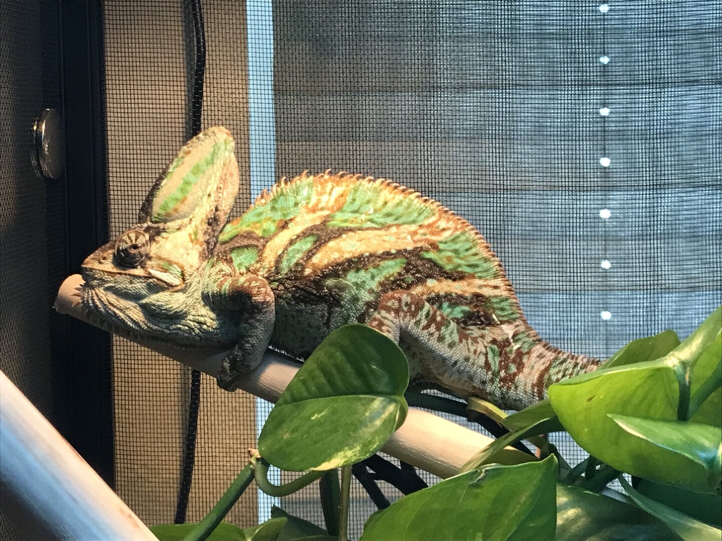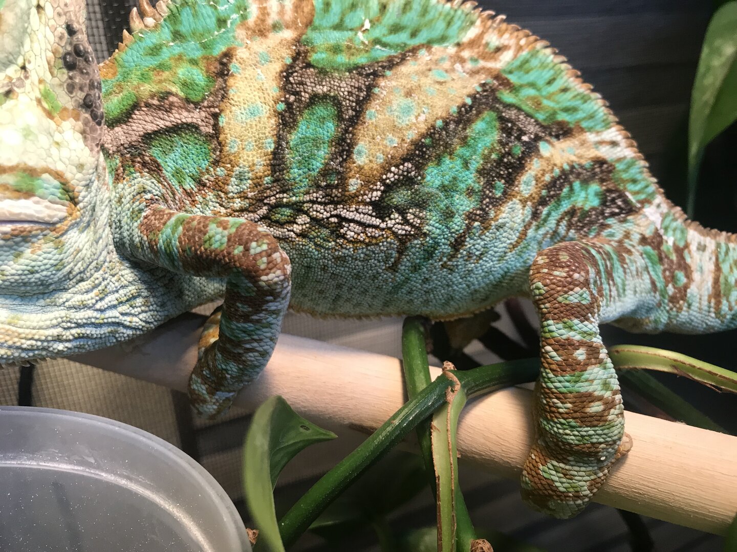 When I received him, he was in a 18x18x36 inch enclosure with a one of those dual light fixtures with one side having a compact uvb light and a blue day bulb. His substate was a combination of eco earth and bark with a lot of fake plants and those rope things you see in petstores marketed towards chameleons. His feeders were also dusted exclusively with the calcium plus d3 supplement powder.