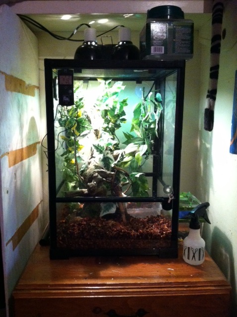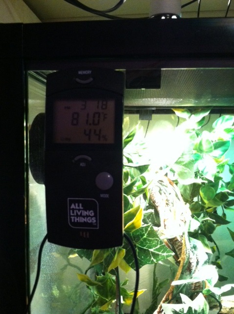 So here is what I would really appreciate help with "How to maintain Humidity" – Since we brought him home, his humidity level has been a pain to get in the right ranges. I was told to place a water dish or similar in the bottom of his enclosure to catch the dripping water because the standing water would help with the humidity. It has worked until about a week ago. We had to move him out of that room for just a few hours to clean up a bit, and I searched how to clean his cage and was told to rinse the leaves and branches, but I didn’t use any form of chemicals what so ever. When I got his enclosure back in its spot, since that day, the humidity will not stay steady anymore. It was holding between 50% to 80% before and now unless I spray every 15 min or so, it drops below 50%. I have included some pictures for you to view with a picture of the thermostat. Any advice would be great! We love, or more so, I love having him here!