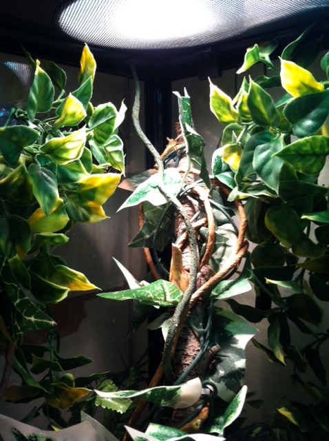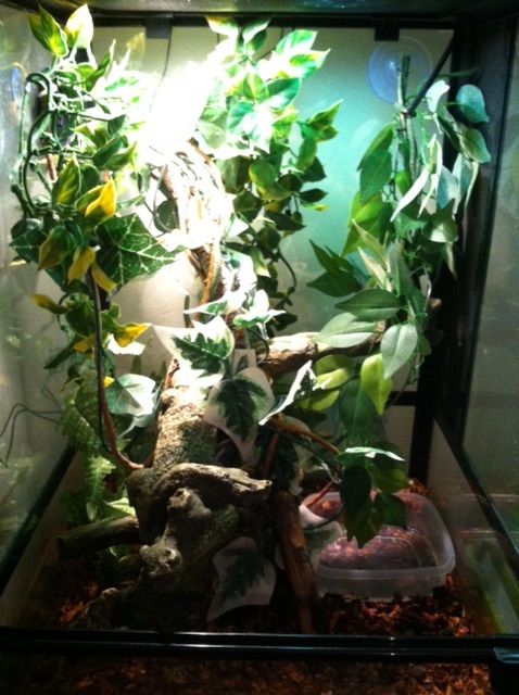 I have researched and researched on how to properly care for him because I am in Arizona, and I cannot find anyone such as a Reptile Supply place that I can go to in order to make sure I have everything that he needs. When we initially bought him, we were sold the ZOO MED Reptibreeze cage that has a screen top, and all other sides are glass. There are small screens on both sides of the enclosure. He has his heat lamps and multiple vines and braches to hide on and in. They also sold me a bag of that Repti Bark which is in there. When we first got him, we manually misted his enclosure with a spray bottle, and then I picked up one of the little dripper bottles that has the black tubing to drip water in his enclosure. He eats sm - med size crickets, about 10 a day. He really doesn't like the meal worms, so crickets it is.