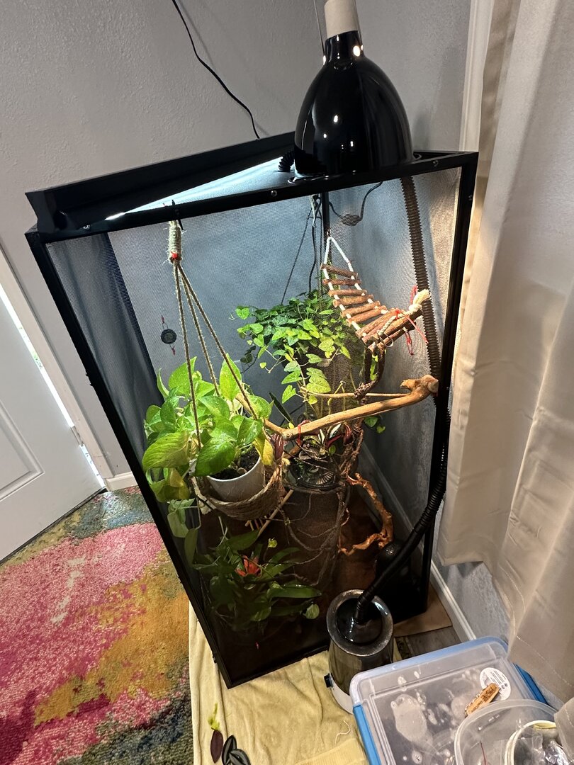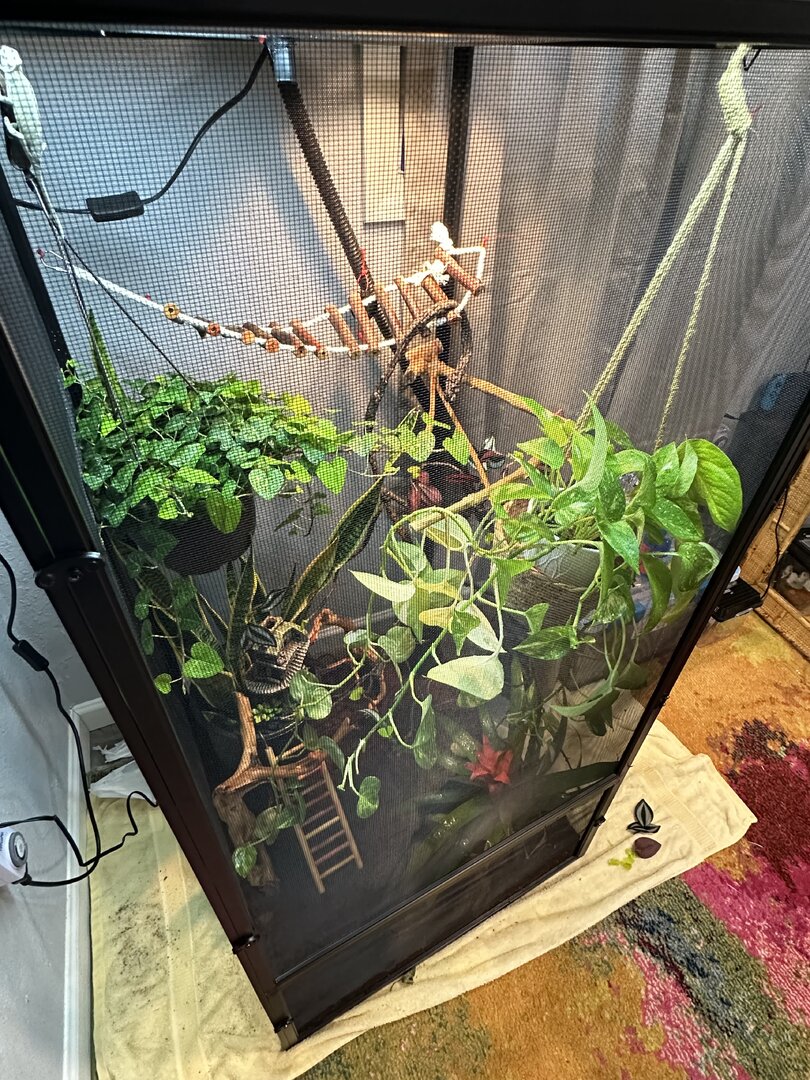 - Plants - Devil’s ivy, snake plant, philodendron, and guzmania lingulata. I have a few branches and a vine, along with a rope bridge, I’m replacing the rope bridge with a branch and adding more sticks in so he has more levels to perch on, I’m hoping to add a 3’-4’ tree in there soon so he can have a sturdier climbing plant along with more trailing/wall cover plants. I use coconut fiber as the substrate at the bottom of my cage.