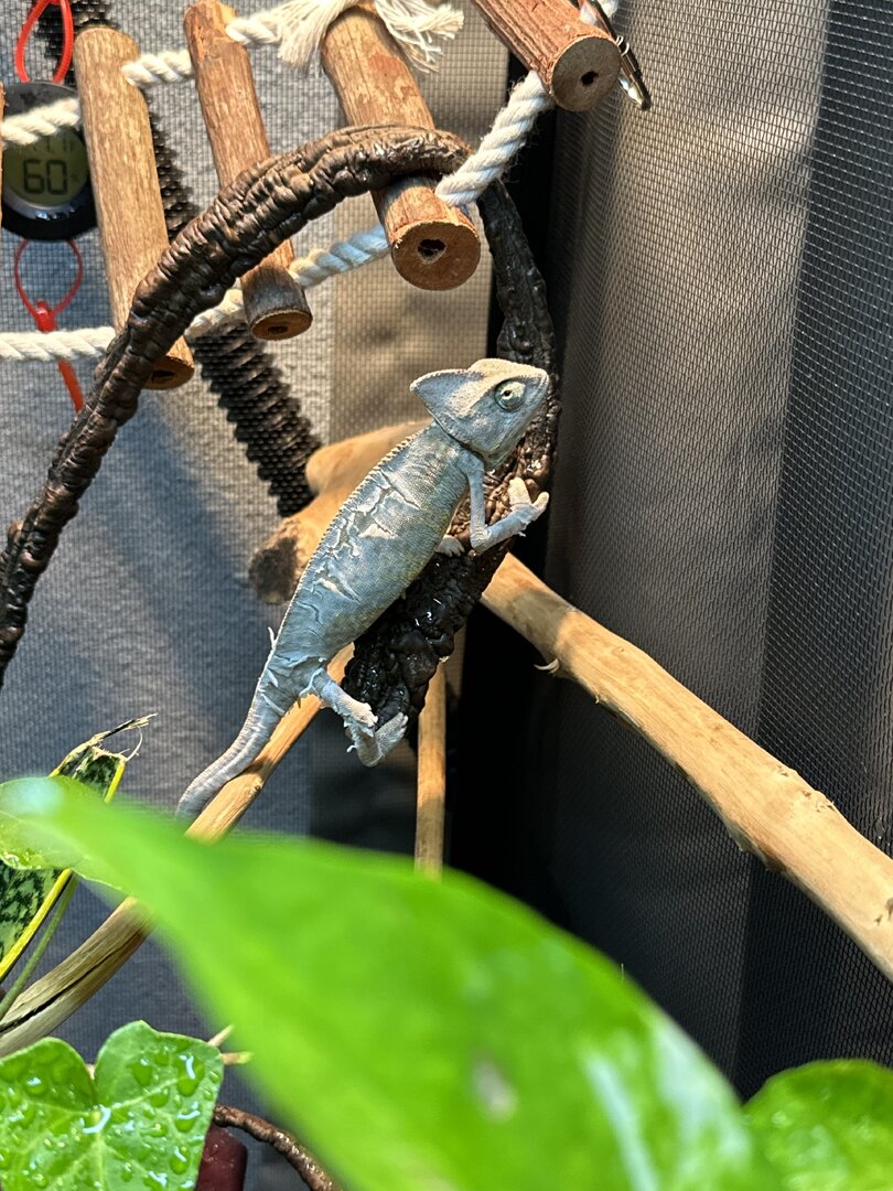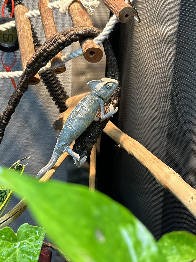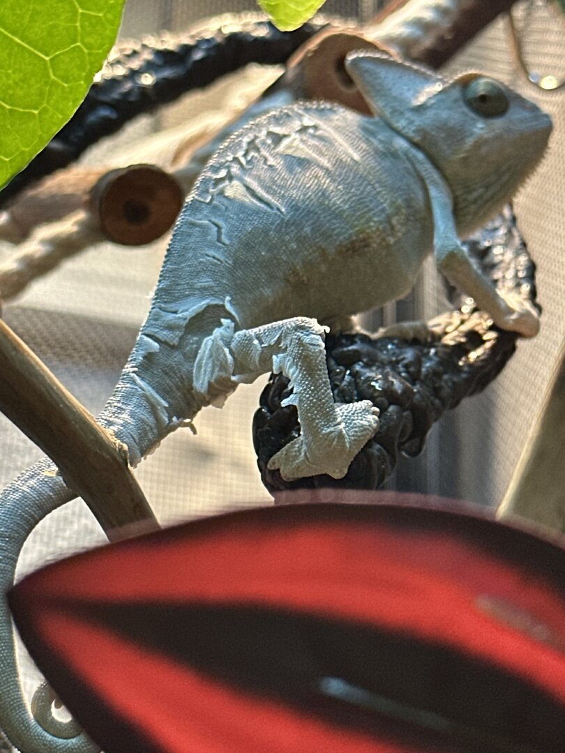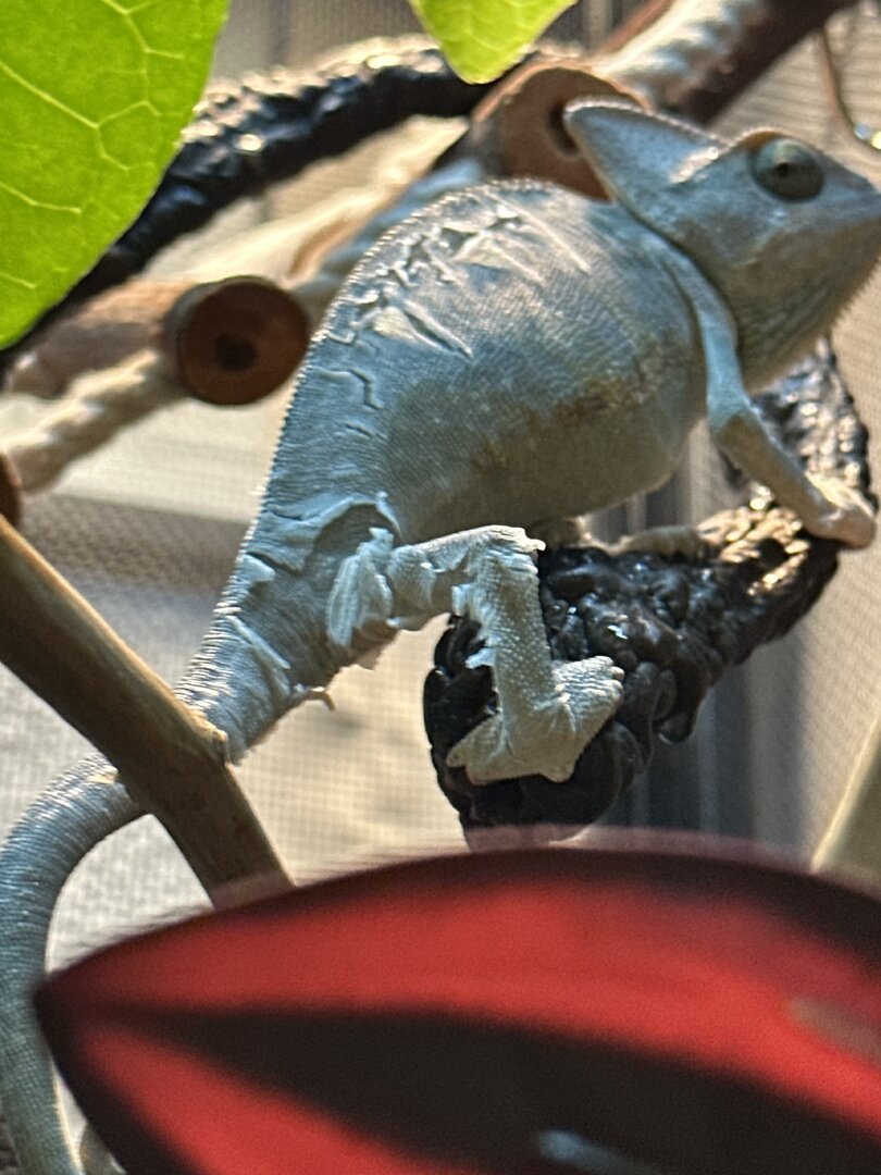 - Your Chameleon - Vieled chameleon, not sure how old (about 3in long not including tail, not sure if that’ll help). He was really pale green with I think was slight sunken eyes. During the day he’s a light brown- mixed green color. Looks like he’s starting to shed