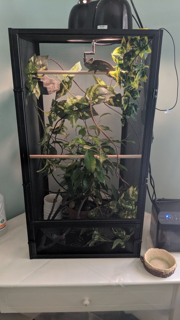 Glad to hear you got your lighting ordered! You said it's a single bulb fixture? If you have a 10.0 bulb in a single bulb fixture it's going to produce a lot of UVB. Typically you want a 5.0 in a single bulb fixture and a 10.0 in a multi bulb fixture. You can make it work by putting more distance between the bulb and the highest basking branch, but the only way to be sure you're providing accurate UVB and not blasting your cham with too much is to buy a Solarmeter 6.5. It's an investment but trust me it is worth the peace of mind. I just got mine recently and it is so much better than to have and not need than not have and wish you did.Thank you. I have ordered the single bulb 24 inch light fixture and the proper 10 tube bulb. I will use the old fixture for basking lights. I have attached some photos for assessment of potential age, health and any suggestions. I also will upsize the cage too in a couple months. I let her eat a few crickets by holding the cup for her each day and she seems calm. I then leave the cup in the cage and she eats everything in about 10 min. I have a tall artificial ficus which I attach a vine to and let her come out. I have done this every other day this week and she always comes out within 30 min. She roams around and then returns to cage about 15 min later. I haven't handled her but I am wondering if this free ranging is good to do. She seems trusting but I don't want to stress her. I have photos of the 2 repashy supplements I have. How do I best use them? Thank you
