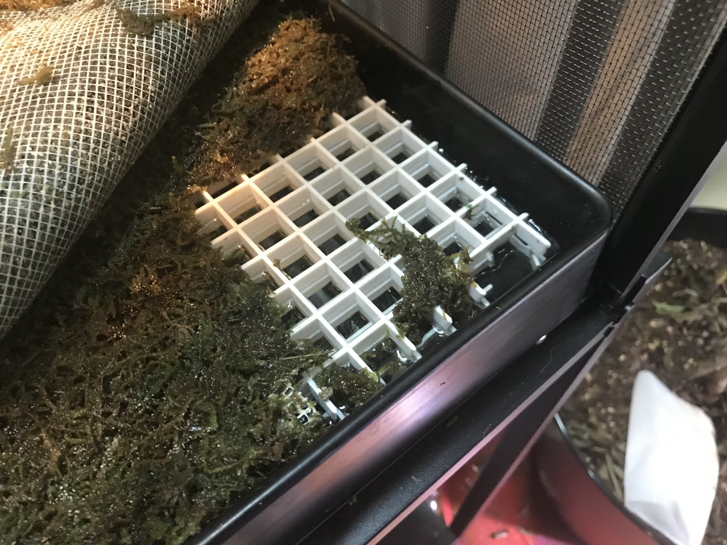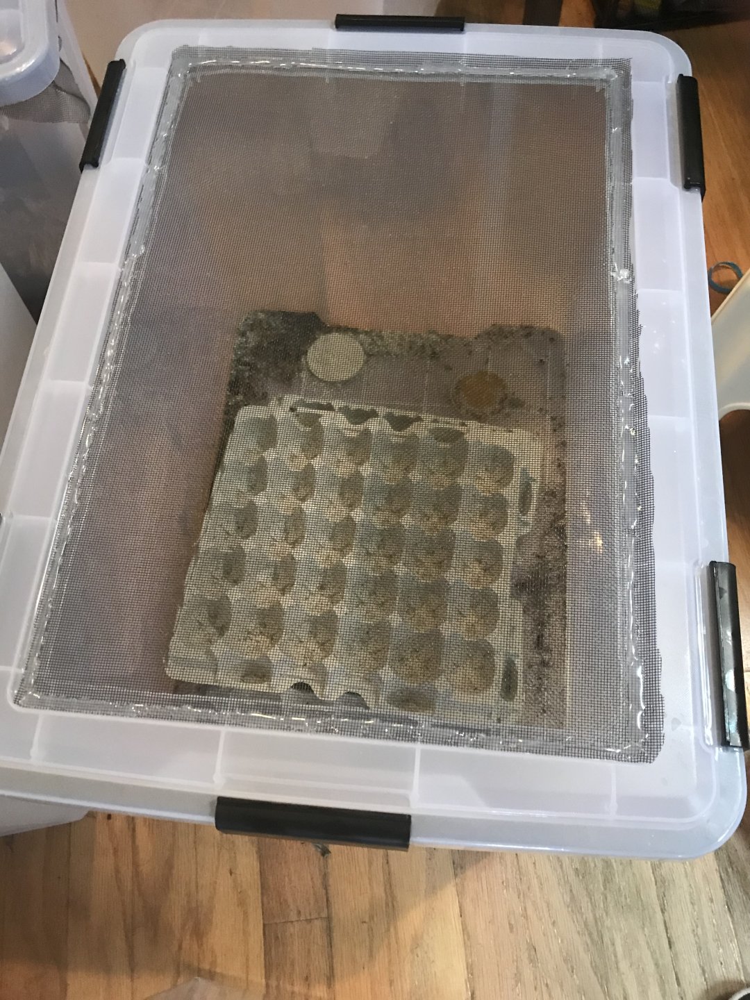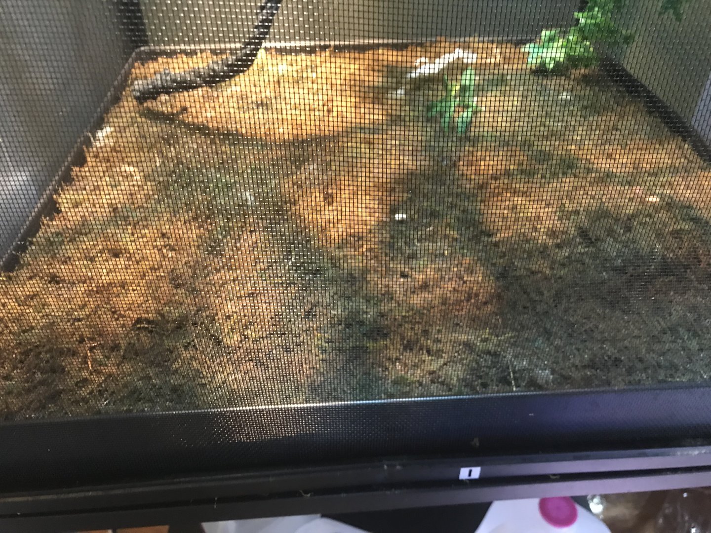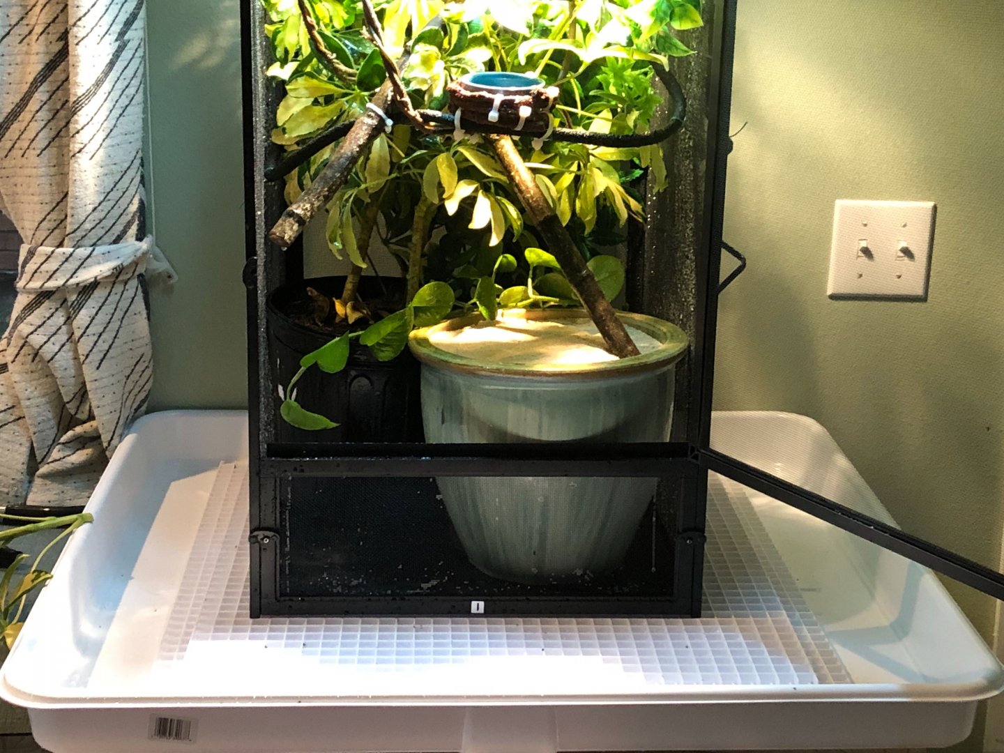 - Watering - I had a brand new garden sprayer (never used still in box) in the garage. We use that with a misting head. I filled it with filtered water from our Brita filter. We spray all of the plants and walls of the cage 3 times a day until everything is dripping wet. We try not to spray Ophelia. We have never seen her drink, but we haven't had her for very long. (about 5 days now)
