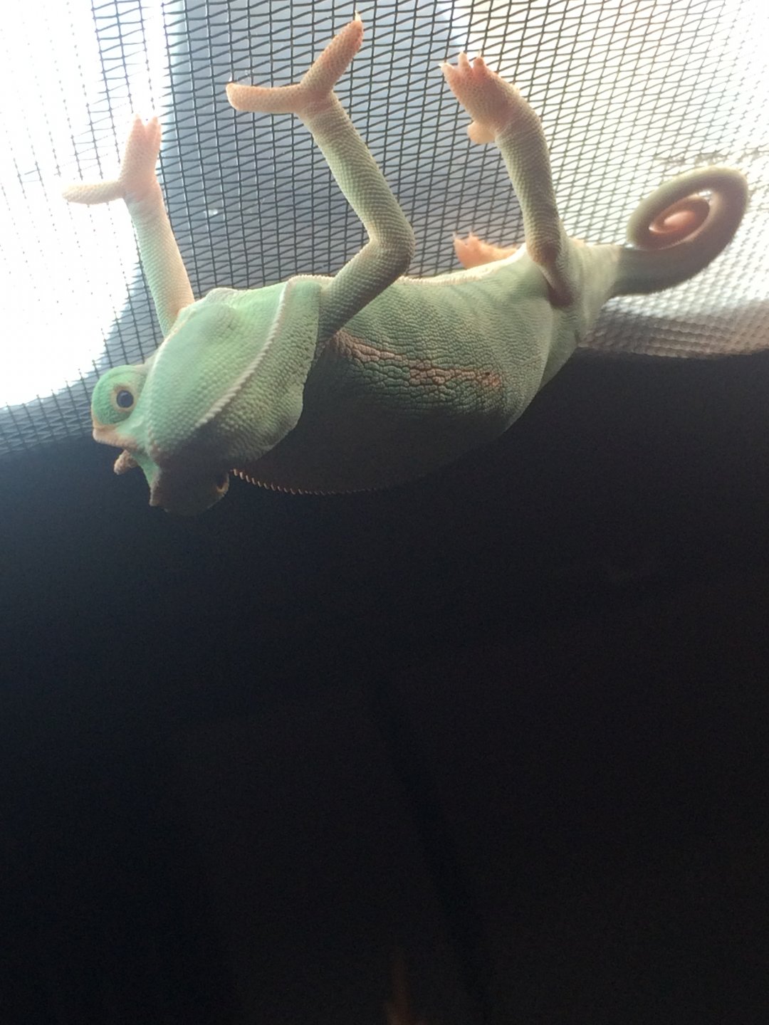 I know I came home to this and was so surprised! After he tried just chilling up there I opened my cage and put my arm out and e crawled right up it and I put him back on his leaves! He has four thick vines up and down and three going from side to side. He loves it in there and is handling so well!