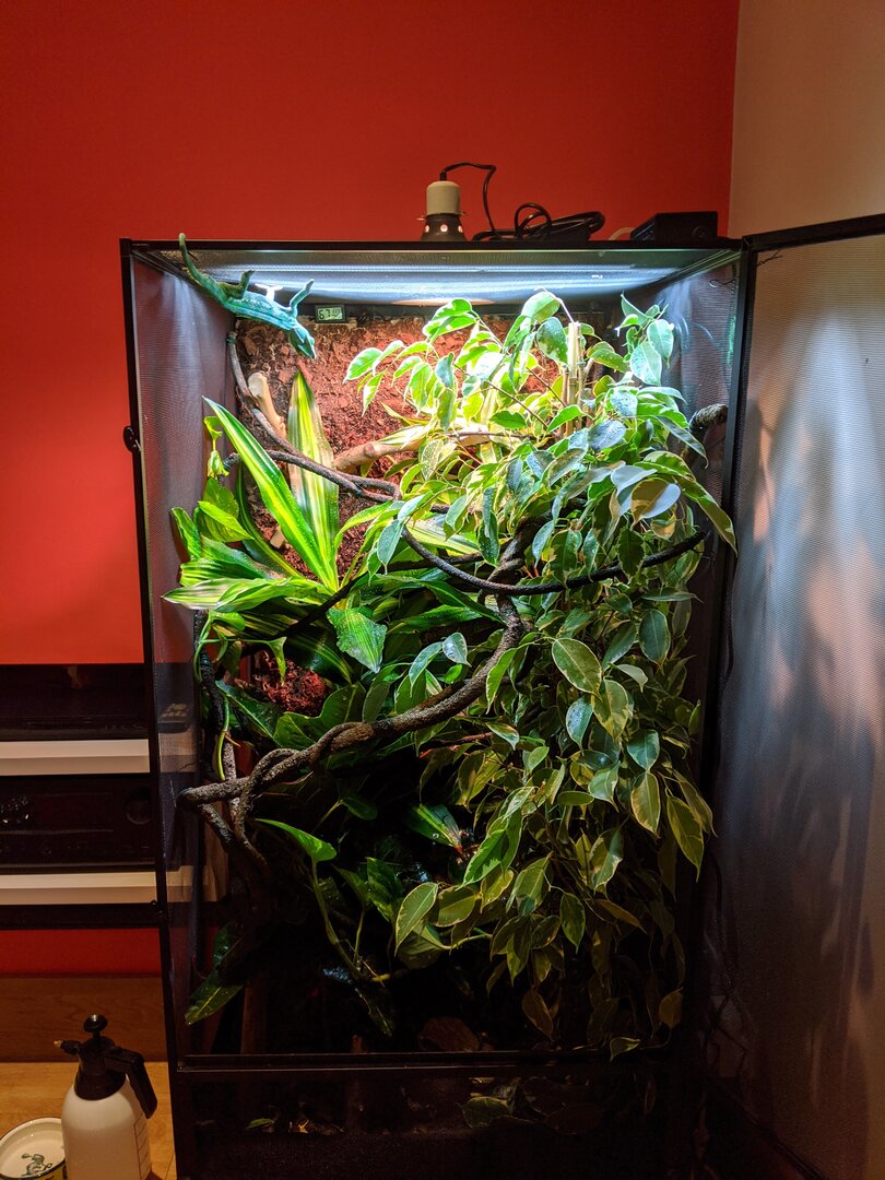 - Cage Type - 2'x2'x4' Reptibreeze with a custom live background and bioactive setup with all live plants.