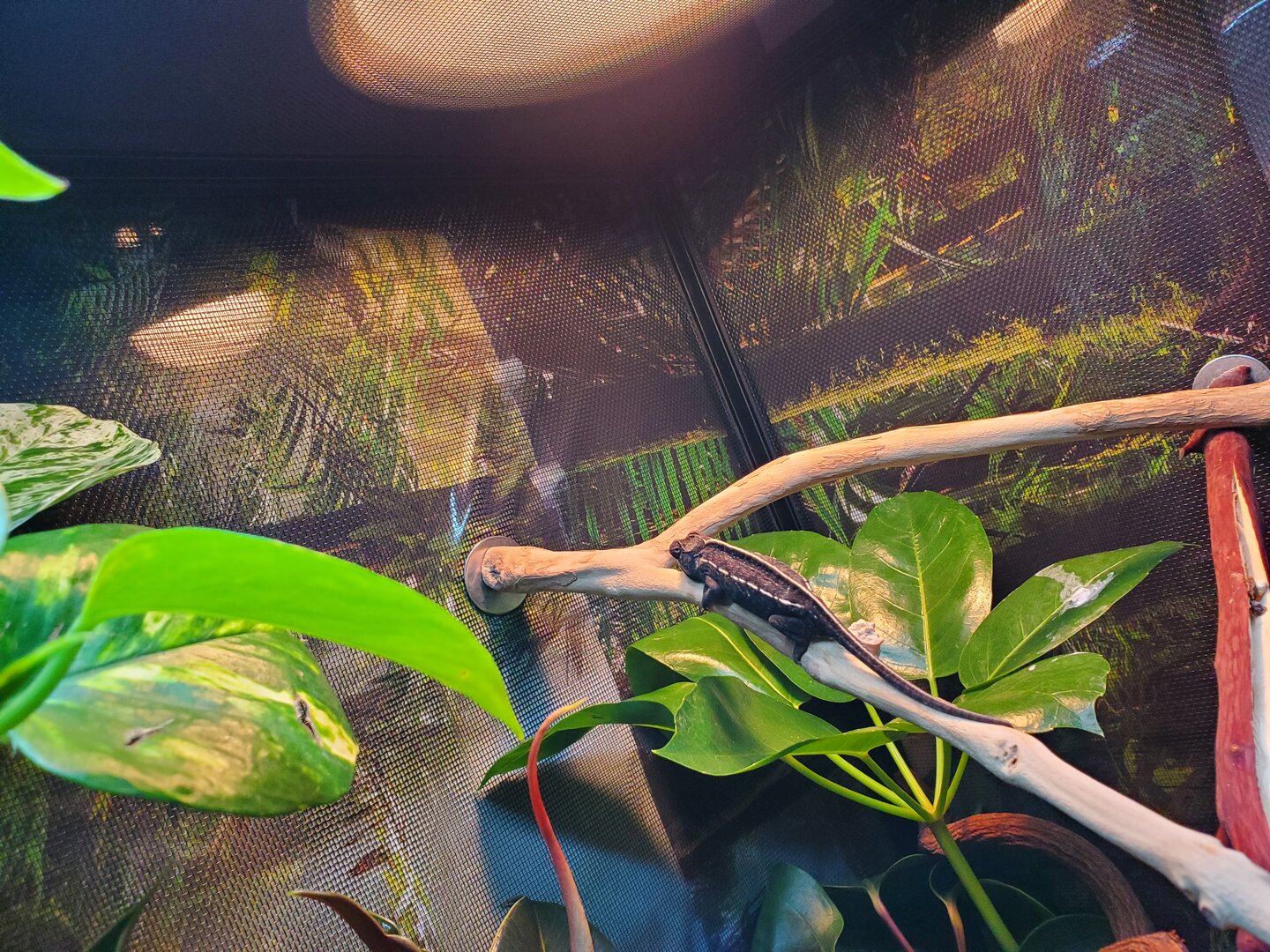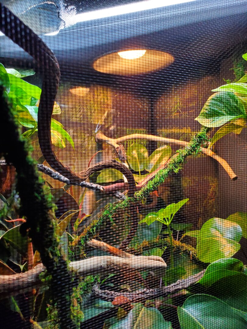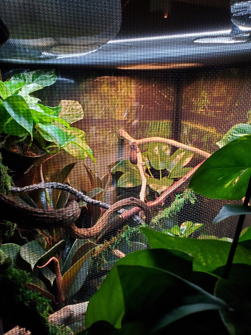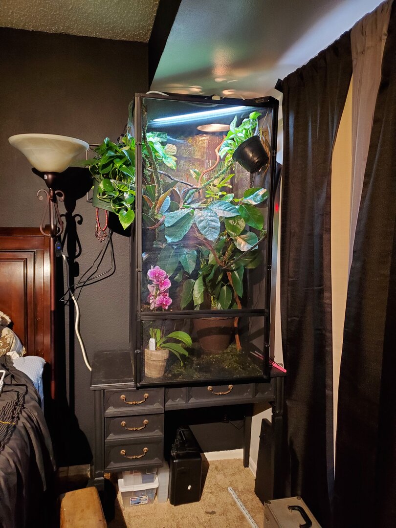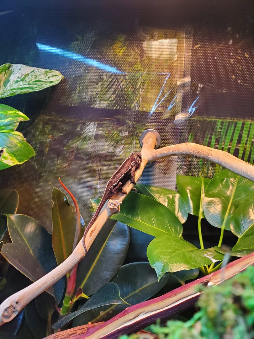 Current Problem - Like I said she is just not eatting so I am assuming it's stress but I would rather dig into this fast incase there is something seriously wrong. She has not pooped yet but also could be stress. She is drinking just fine. And likes to move around the top part of her enclosure. She has not ventured down amongst much of the brush she really likes her branches in the middle and then higher up in the basking spot. Sorry the pictures are not very good as I don't want to disturb her too much. Just a quick in and out for feedings. Oh also the full picture does not show her dripper on top. Thank you all so much in advanced.