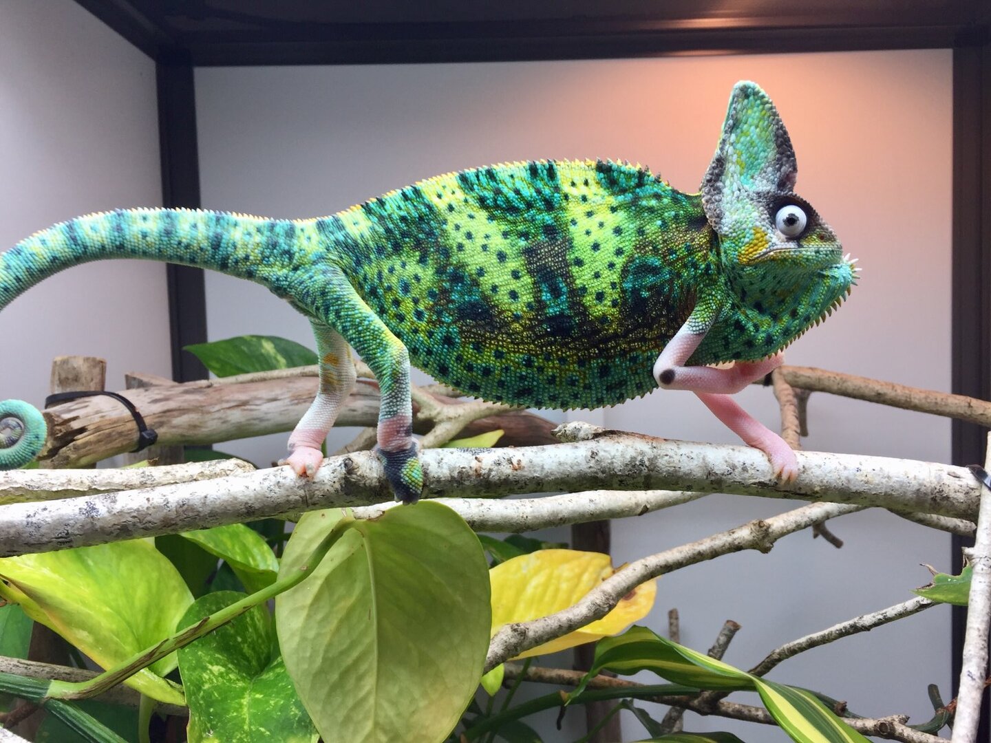 It all started October 20th of 2018. I went to Petco to look at getting a betta fish for my desk. I work from home and the day to day gets a little well boring.. So I thought I would get a fish. I walked by the reptiles and realized that this little chameleon was following me across the front of the glass case. I went back and forth a few times to see if he was in fact following me. And he was. This was when Beman picked me. I went home trying to think up every rational excuse not to get him but after 3 days of him being my only thought and trying to find info via youtube and other sites (I had not found the forum yet) I went back and got my baby boy. He was roughly 4 months old at the time. The info I had found online was awful and the petco advice for what to buy was worse but I just did not know that yet... I spent $400 on everything they could sell me that was incorrect from the kit, supplements, all the extras, and of course mealworms. And did I mention I was told to gut load with just carrots.