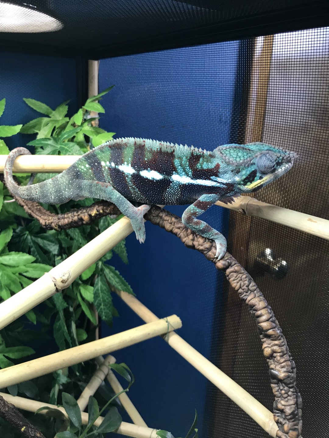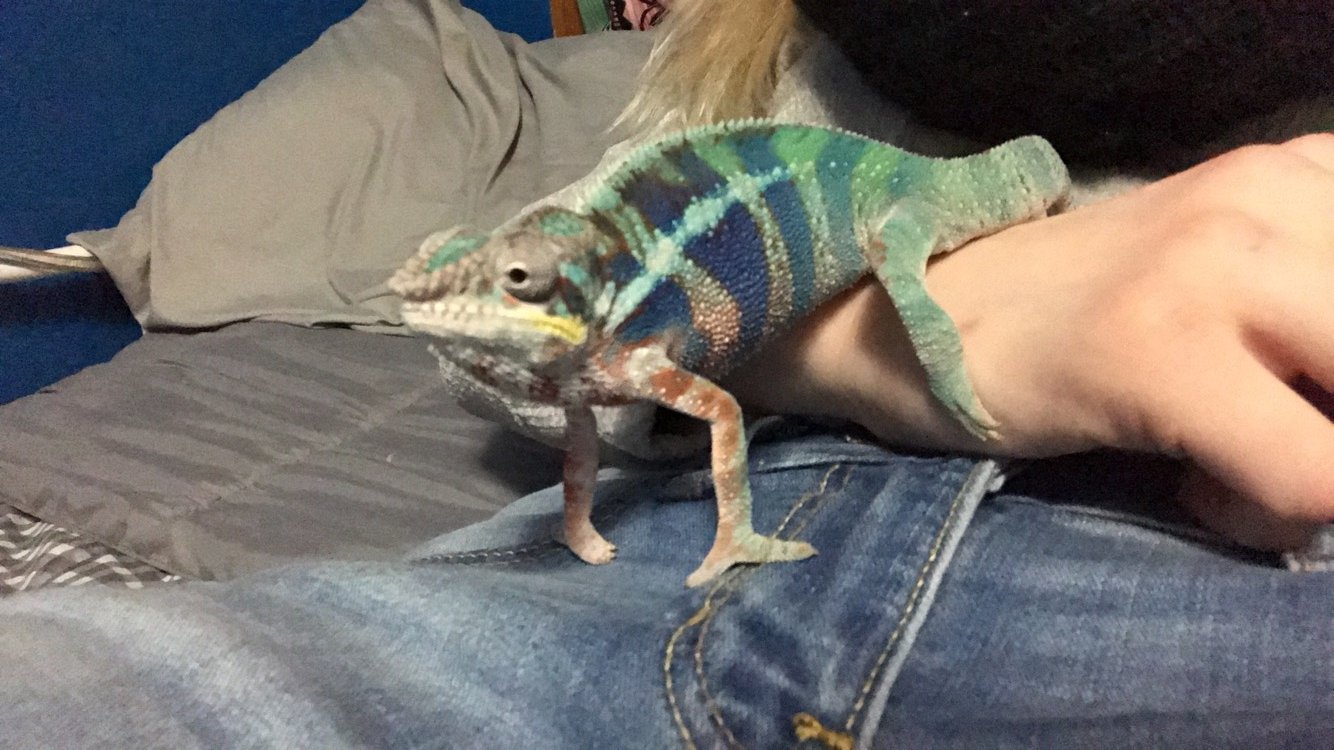 My male panther chameleon is just under 8 months old and has been in my care for about 2 months now. He has been doing great up until recently. He’s usually extremely bright colored but now he’s a dark grey almost black very dull colors. I had taken him to the vet and they found worms and parasites. They treated him for his worms and gave me medicine for the parasites. I gave him that for 7 days every 24 hours. Yesterday was the last day for his medicine and he still seems to appear really dark. Darker then he’s been. He has been eating and drinking. I feed him dubia roaches, super worms, crickets, and occasionally horn worms. I mix it up so he doesn’t get board. We just changed his cage with an umbrella plant with bamboo and vines going through out the cage. Every day I’ll keep his cage door open and let him do his thing. He will come out and roam on his own. I watch him and he will come to my hand. I use a 100wtt basking bulb for during the day along with a 5.0 uvb lighting. At night I use a red bulb that’s 60wtt. I wanna get some info before I take him back to the vet.. my last vet visit came to $170 and I don’t have that right now. I have a picture from about 2 weeks ago, he’s pretty bright and the next two were taken now of how dark he is. He’s dark, the picture doesn’t show any justice. Any suggestions??