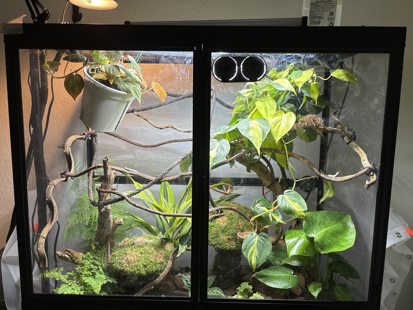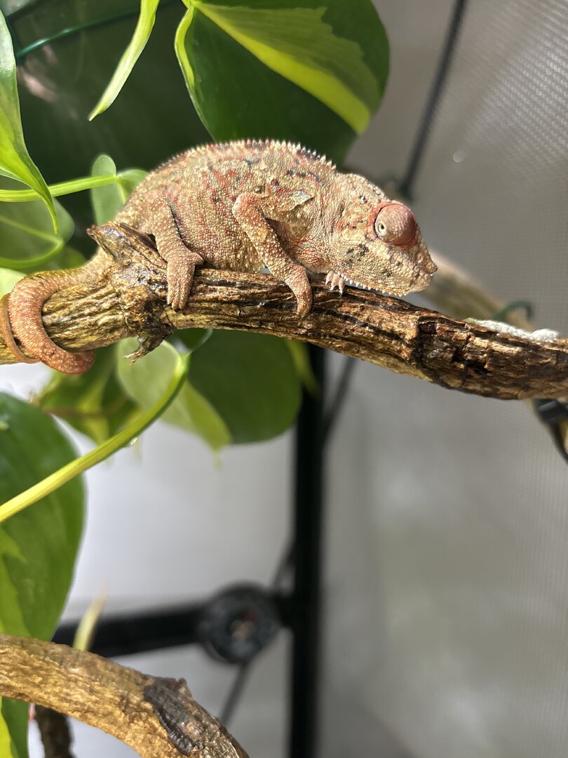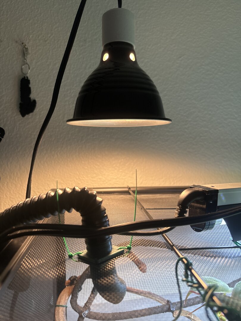 He pooped in front of me (on a plastic dish) so I am going to send it in for a fecal test. I fixed the height of his light to the correct distance and hung another plant for him to hide in.