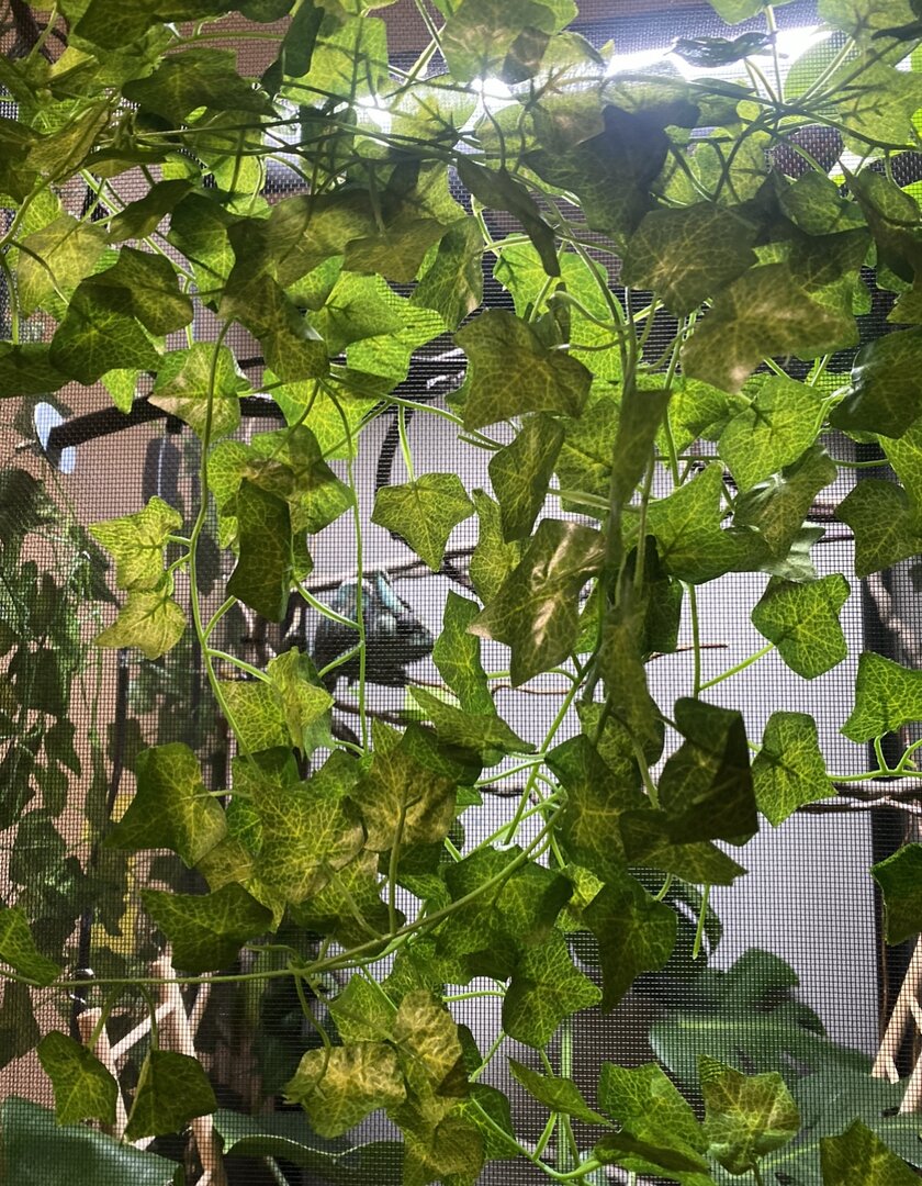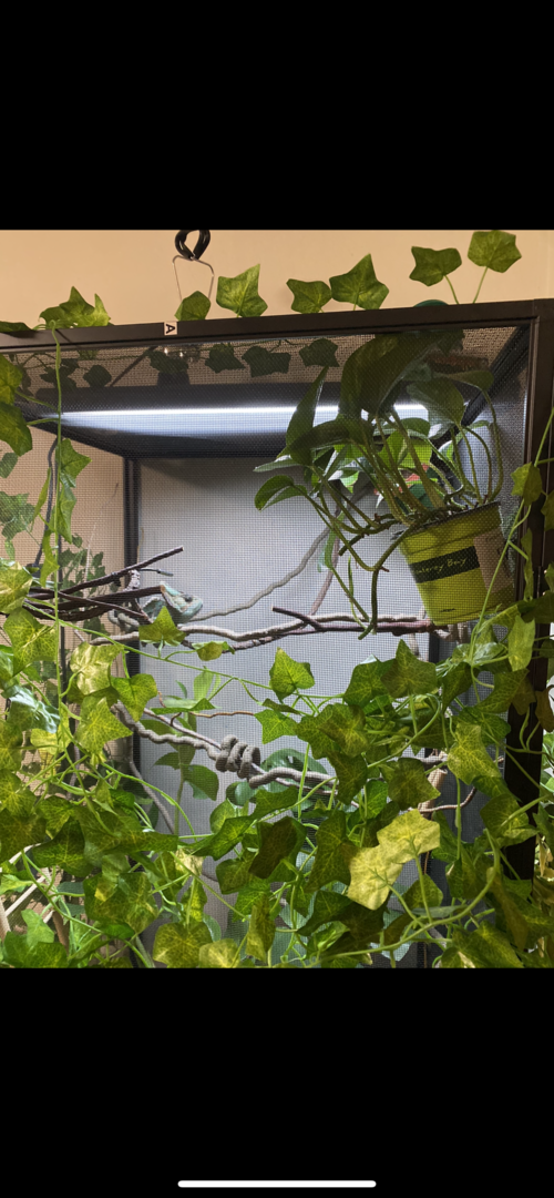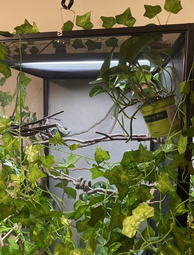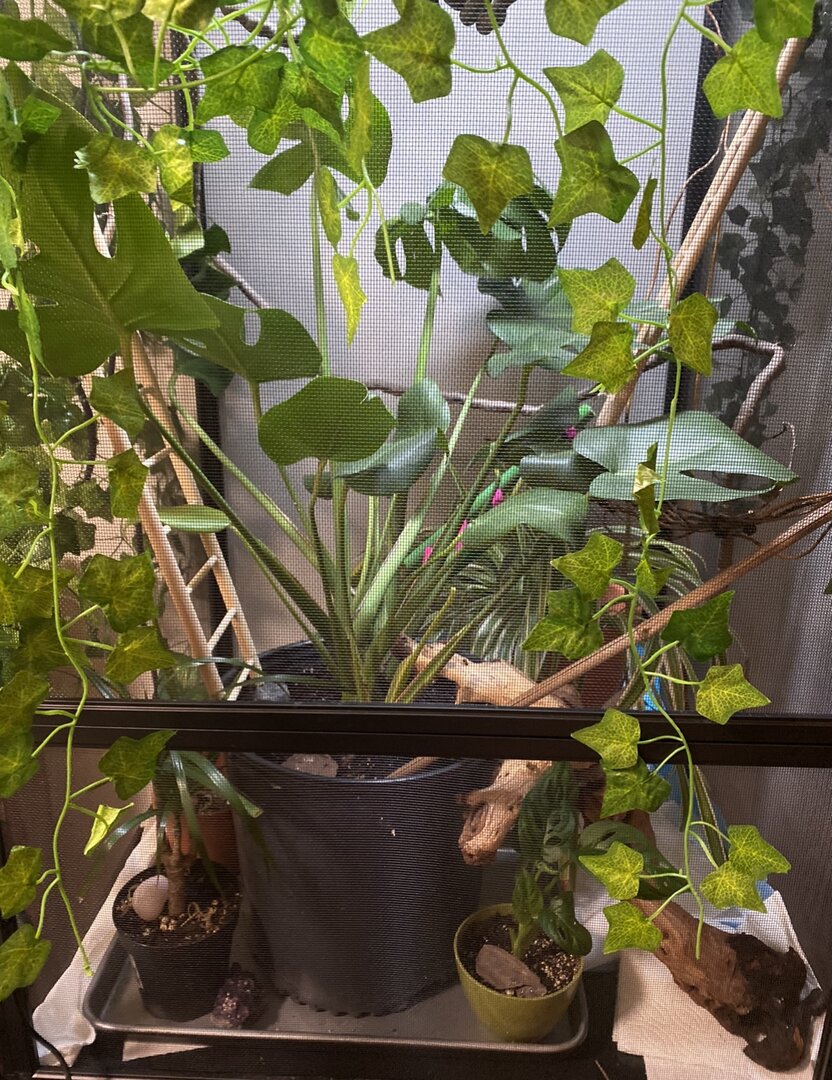 Plants -We are using live plants, we have a monstera as the center but will be getting something sturdier sometime soon, pothos, spider plant, a small swiss cheese plant, and a small dracaena. We will be getting a lot more bushy and tree-like plants as well as more branches and vines to fill in. We just want him to settle in for a bit longer before we mess with his home again. Fake silk ivy vines on the outside so he feels like he's in a tree.