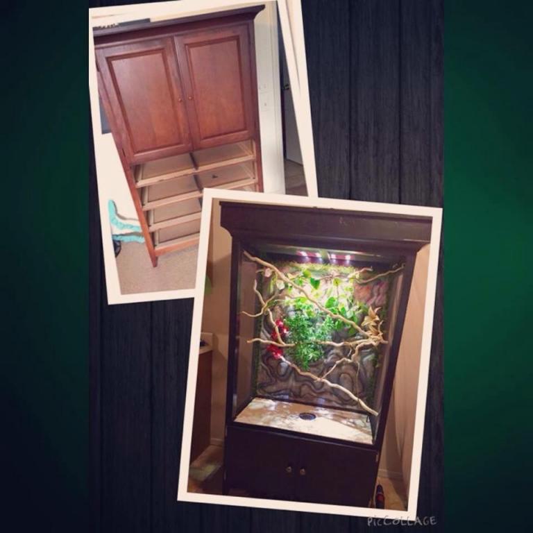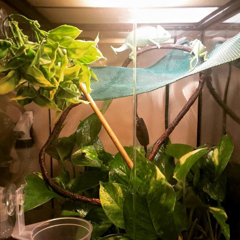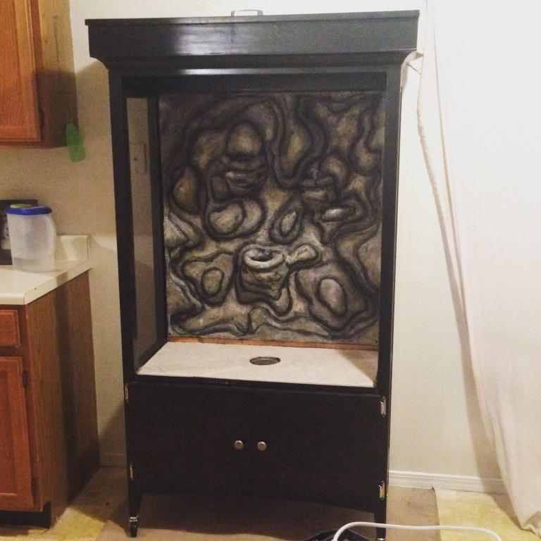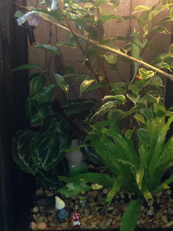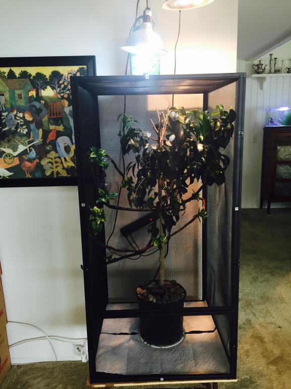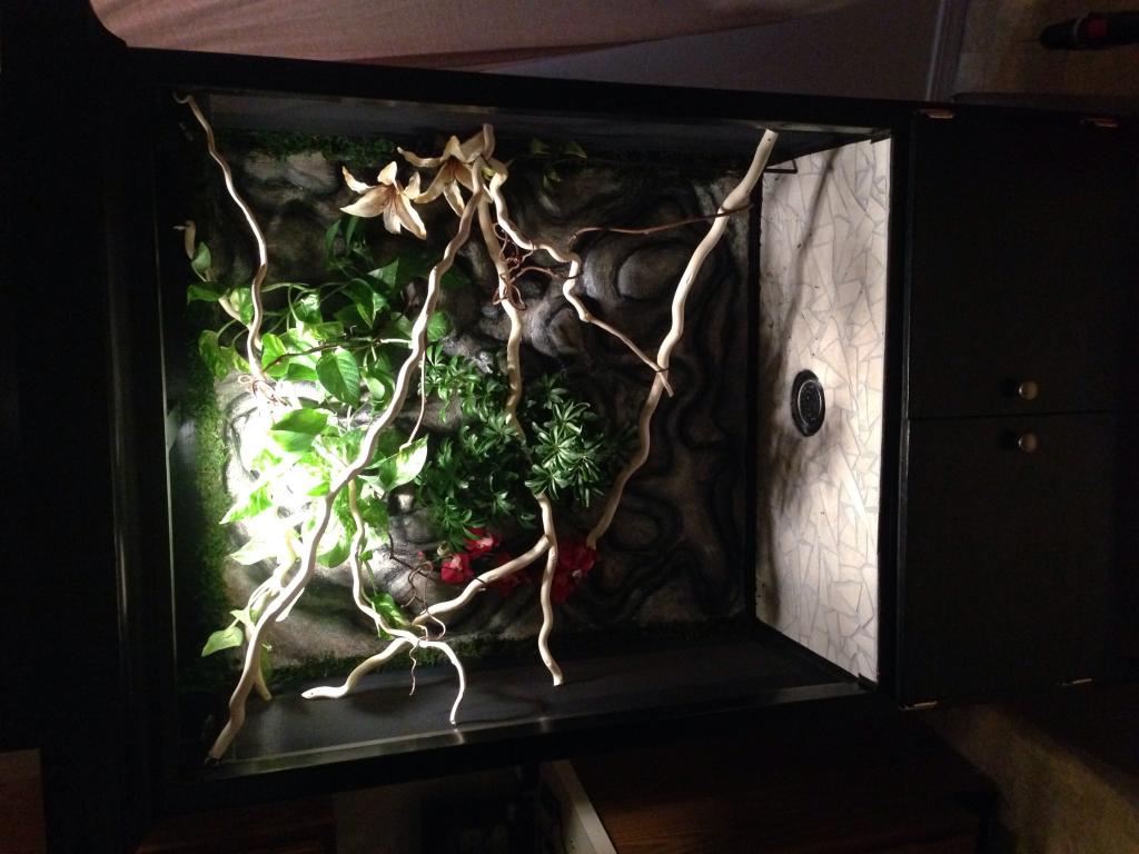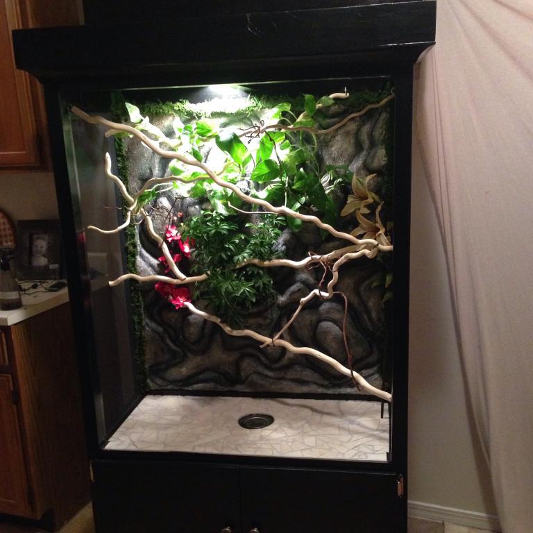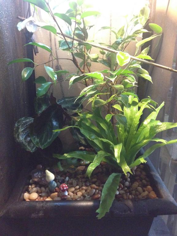 He cup feeds so hadn't thought that the rocks would be an issue but, I'm going to be covering this with something when we elevate the cage. I'm not sure what yet. Do you think that the exo terra moss rolls would be a good option? I just ordered more plants so I can hang small pots on the sides of the cage. What's the best way to cover the soil?looks good.Becarful with those small rocks at the bottom,theres a good chance he may eat them at some point.When my panther was young he ate a really good sized polished stone and luckily passed it.