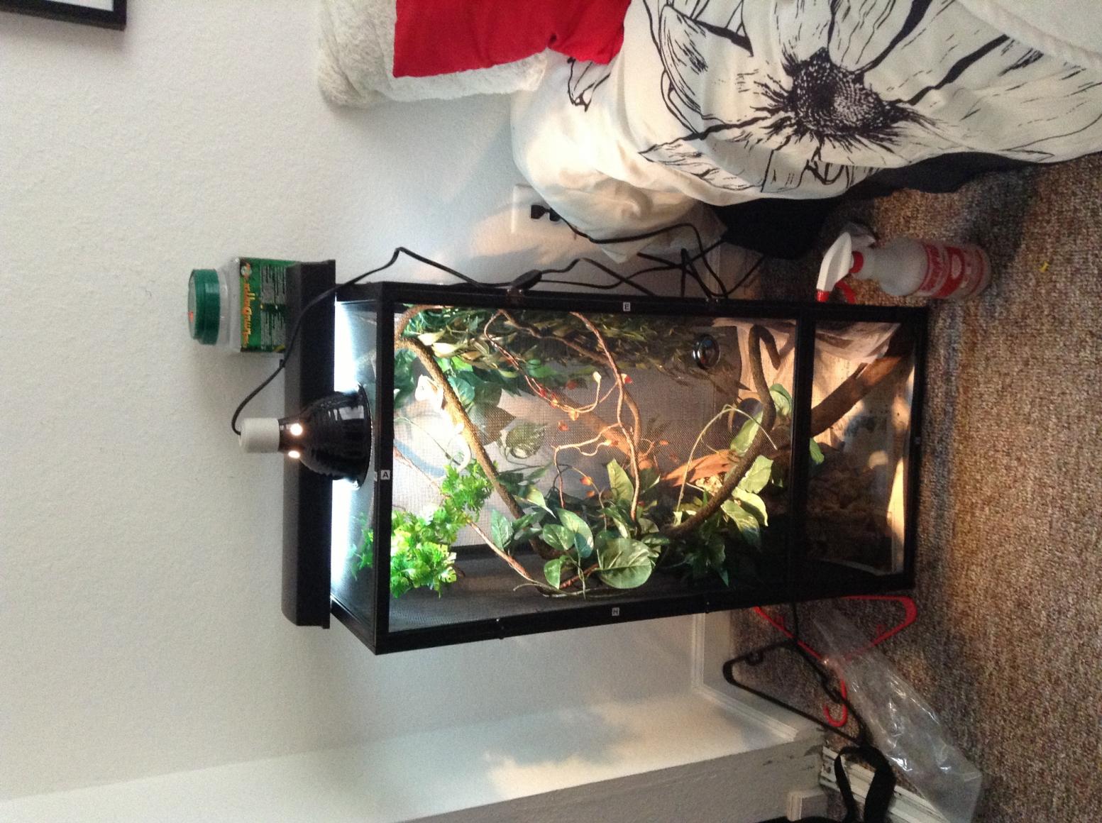 I am currently staying in an RV on my property until the new unit is done and I thought where can I place my chams and instantly thought of the shower so I netted of the doorway put the sun dome on hinges and set up my lights (during the daylight I open the sun dome so they can get some sun and fresh air). I am currently using two repti-rains which I modified one to pull its water from a small bucket increasing its capacity, the water then drains into the holding tank which is hooked up to my septic tank. At night I use a small heater to make sure they stay at a constant 80.