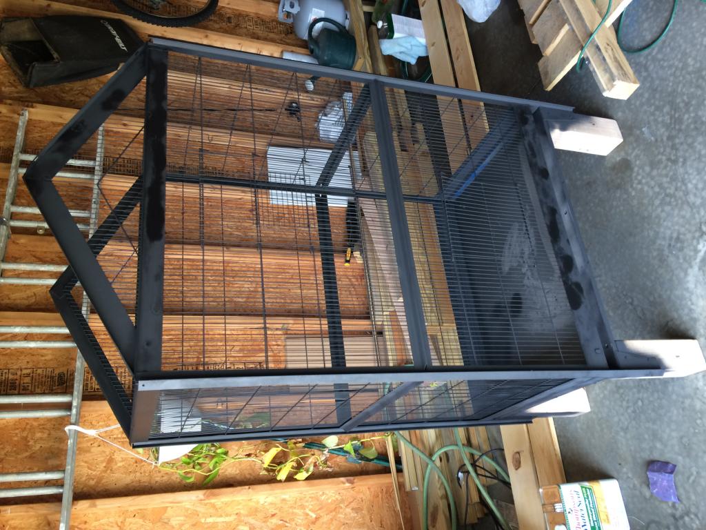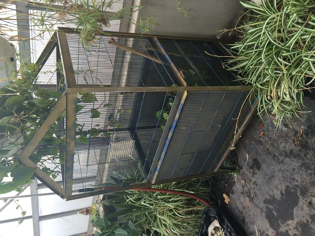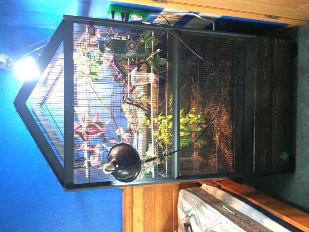I got this cage from my agriculture program at school. The cage started as a finch cage and two years ago a few friends and I changed it for a veiled cham, she died about a year ago and the cage has been in a greenhouse ever since. I decided since i needed a new cage and my teacher was retired and I was graduating i would buy the cage. Sanded and painted it, made a whole new base for it, and but plants in it and it was done!.