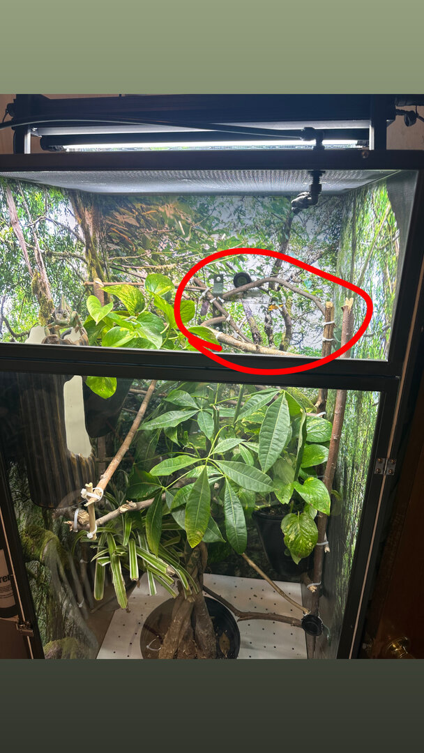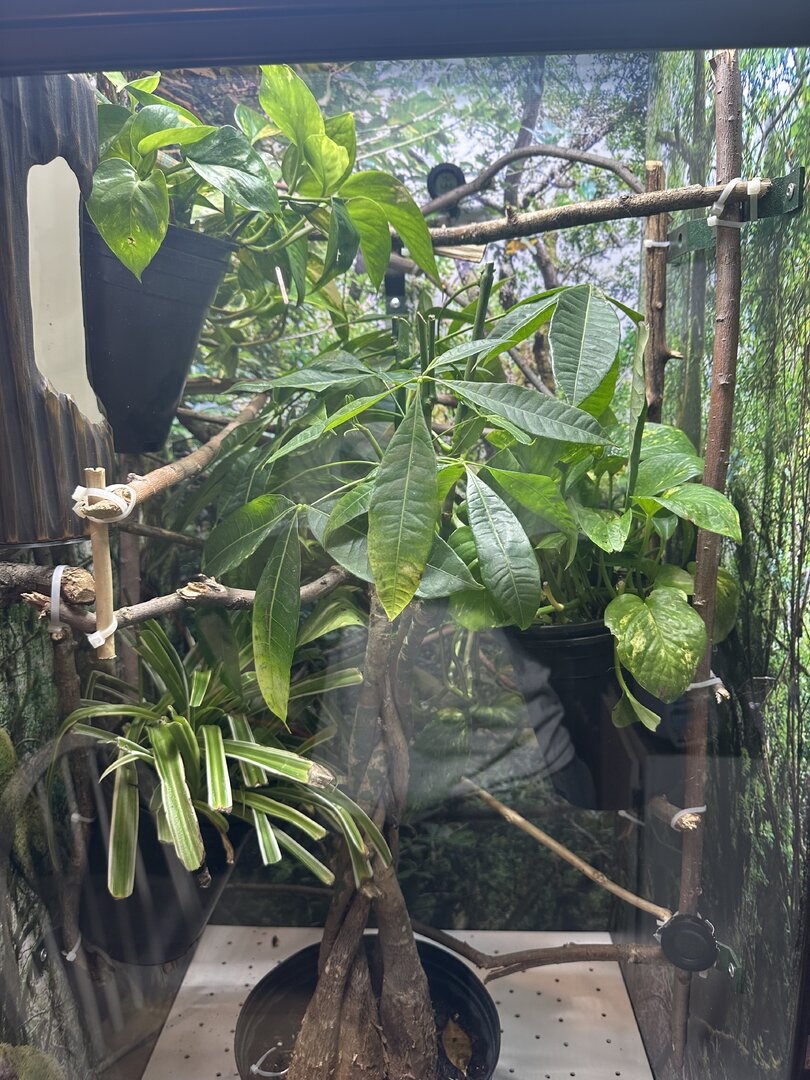 Do you guys thing I should fill this space? I feel like I could give him a bit more cover in the upper back right corner. I bought a prayer plant that I need to wash and repot still but I think it would look good there. Also added the tackiest looking branch connection to give my guy a better run to his feeder and think it looks dumb but it’ll work great lol I wish I woulda brought brown zip ties when doing everything.