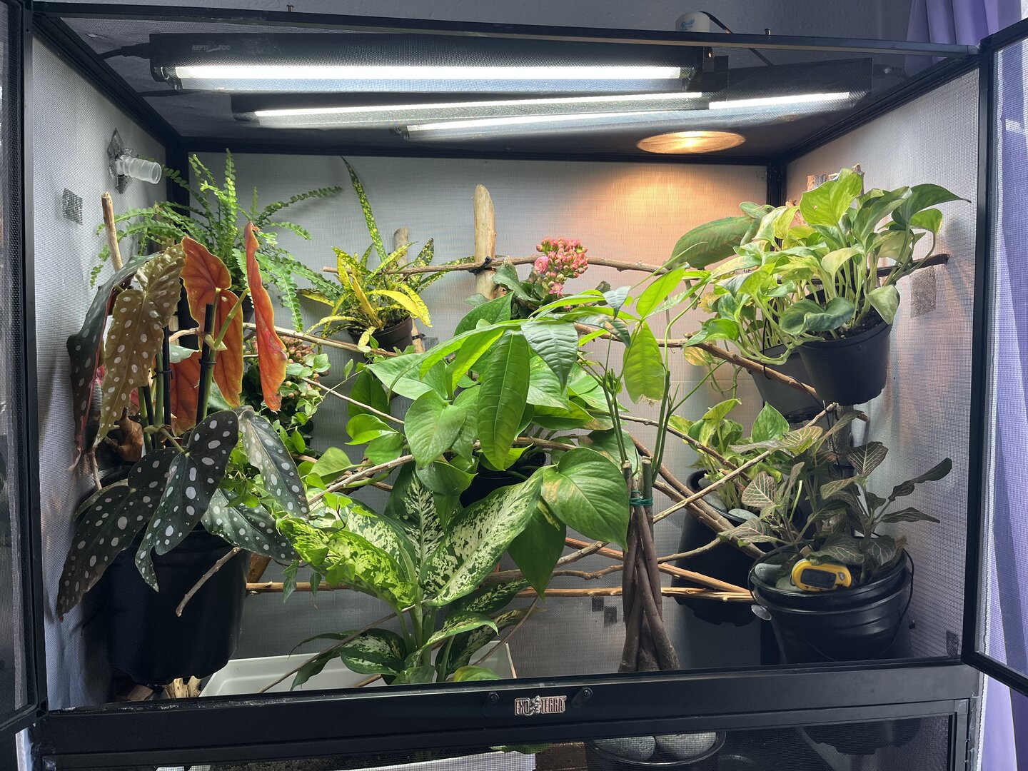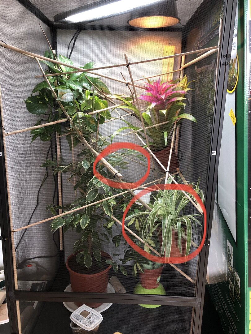 Hello everyone, after my baby cham spent a couple of weeks in a small glass cage (15x15x30cm) for almost a month now he has a big Reptibreeze cage. I could really use some tips, because I think it lacks something. He doesn’t seem so happy in it. The first days he used to go up and bask, but lately when I go to him in the morning to feed and spray I always find him in the lower middlish part of the cage and when he sees me he runs off to the back of the Ficus Benjamina ( where he usually used to move to every evening around 19:30 to get ready to sleep.) The last days he spends most of the day back there and he doesn’t seem interested in the crickets I give him either. I don’t see him bask under the basking lamp at all and I’m pretry sure it’s not too hot (around 27-29C). He did eat some flies, but I’m pretty sure he doesn’t eat enough. So I’m thinking there’s sth wrong with the cage. I would appreciate and I’m open to any opinion or criticism on how to make his home better. The bigger circle is where he is every morning before I turn on his lamps and the smaller circle is where he stays all afternoon and then sleeps