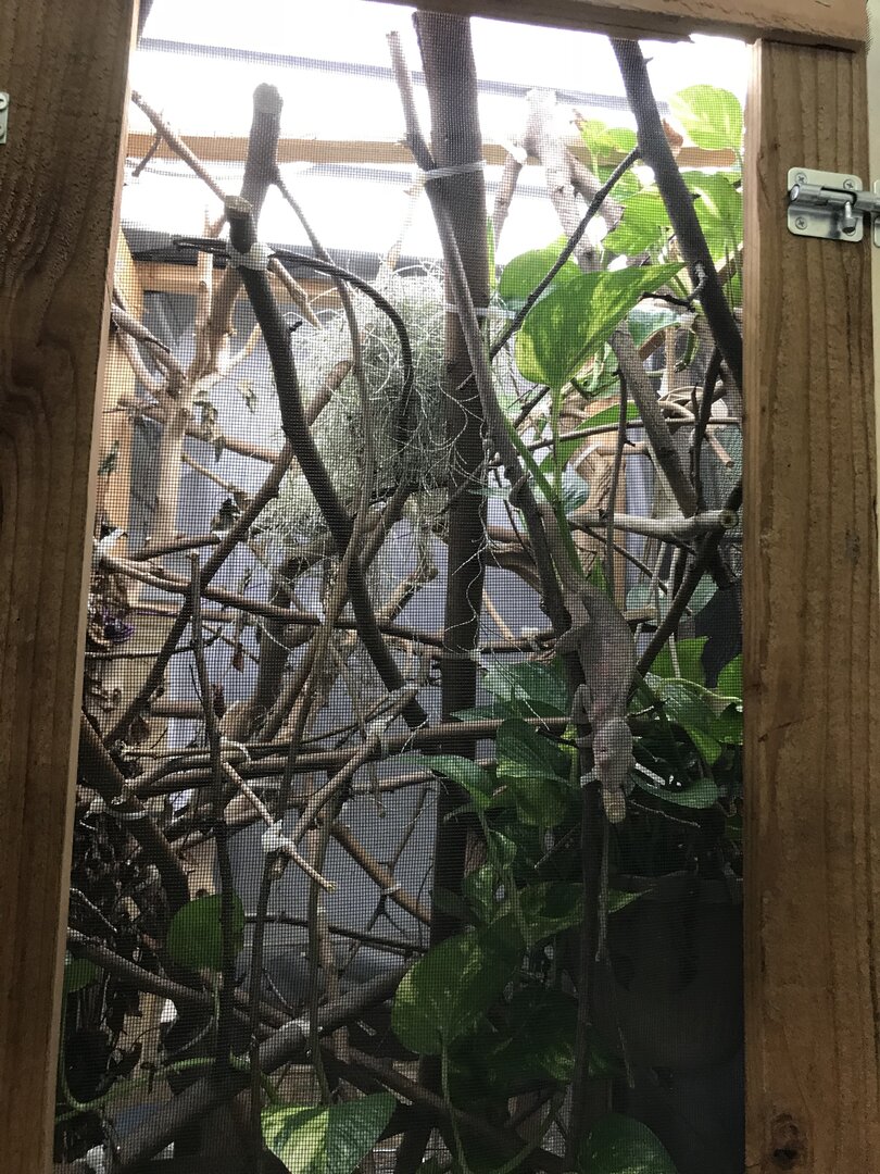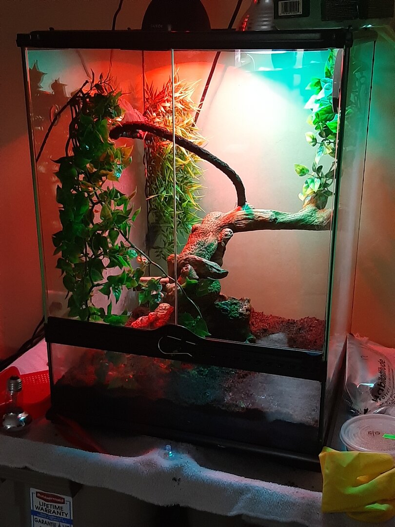 If someone could help it would be appreciated... we do have some greenery for him and a branch, I added one of the vines this morning before I went to work and was planning on adding the other one later as I was worried he got himself up on some greenery without a way down so he was stuck.