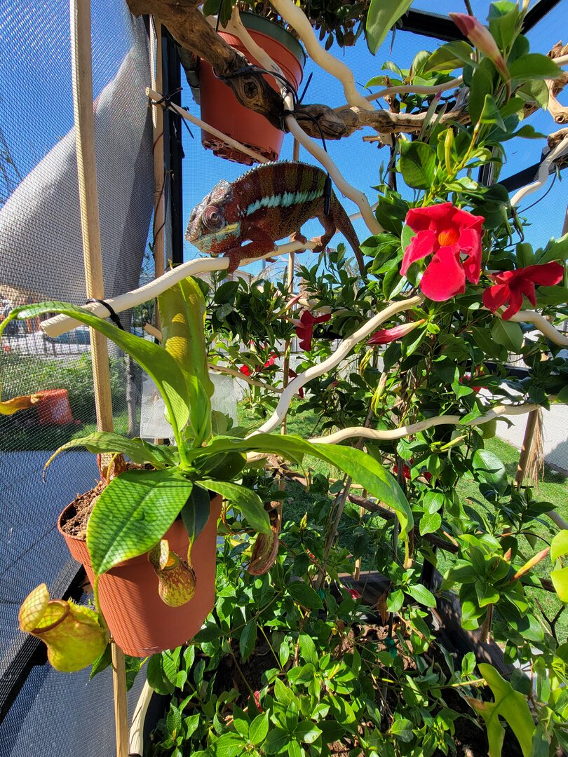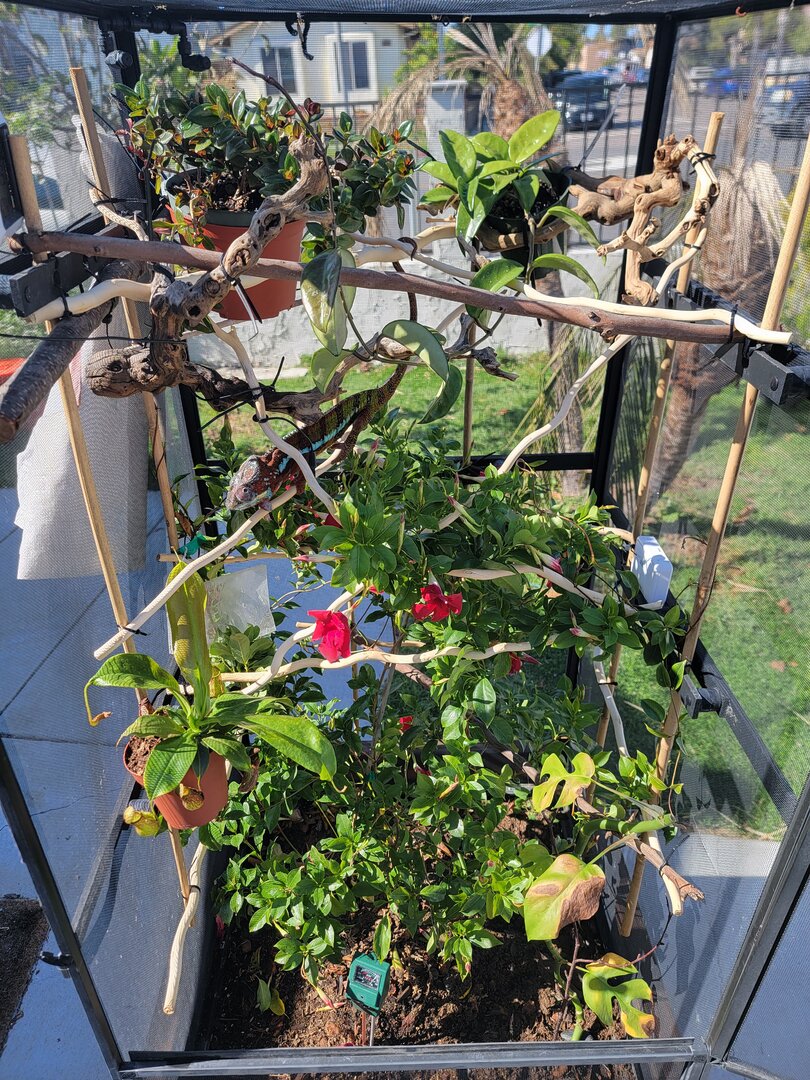 I had some thoughts on putting a schefflera or a larger croton or maybe a dracaena in as a center piece and having the vine work it's way around the cage I just don't know how full it will get. I'd like this to be densely planted so that it provides shade and shelter for the chameleon and adds a nice visual aspect to the yard.