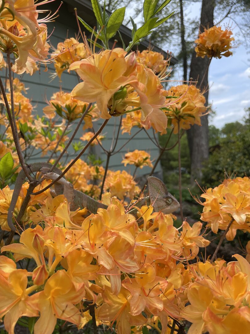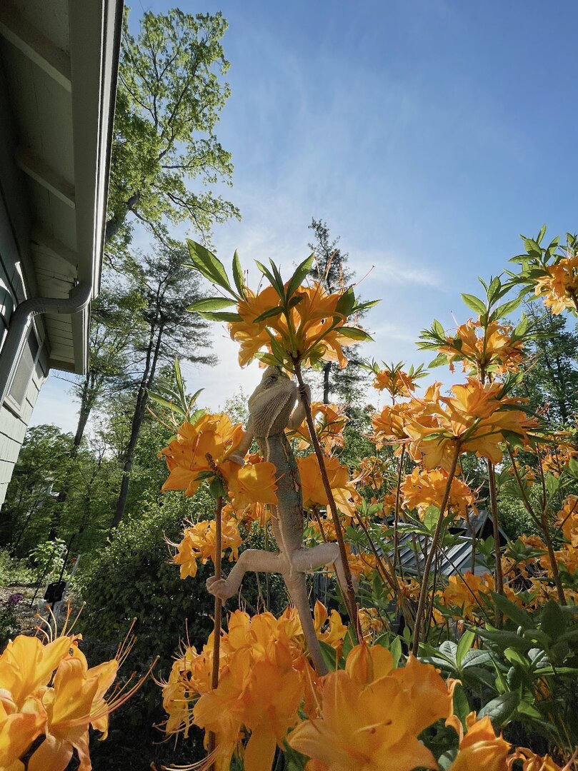 so it’s starting to heat up here in WNC which warrants me to let my chameleon, Rasta, outside for some natural heat and uvb time. This was an everyday norm for me once I got home from work and he earned my trust for me to only check on him every couple minutes while I sit nearby and read. He would rarely move and if he did I would catch him before he gets to the ground. It was a 5 foot high azalea bush that he would recognize right away and start basking in the top branches. He loves this time of day so much and so did I