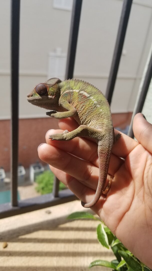 Here are a couple pics of the floater, a few hours post-floating. Sorry for the poor quality, it's VERY skittish since I handle my chams as little as possible. The metal squares are .5 inch for size reference.
