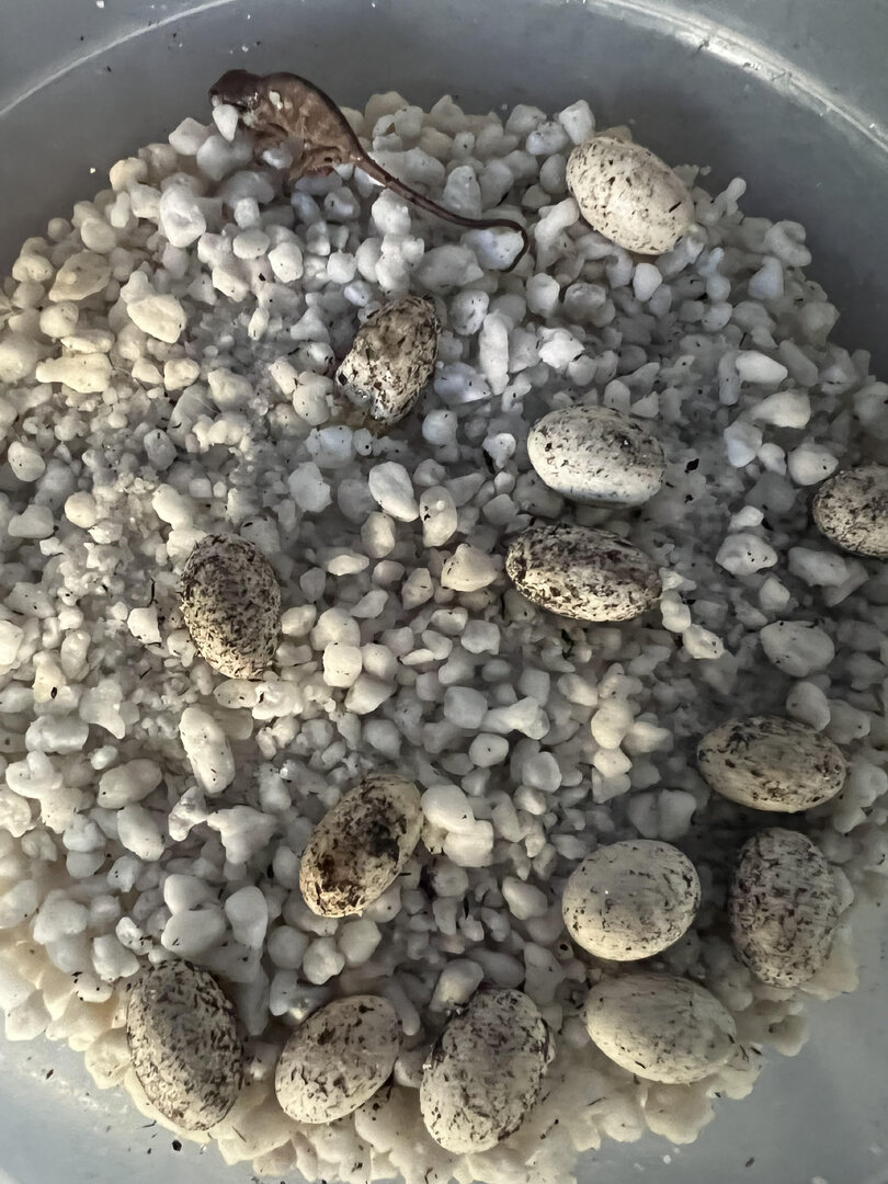 Definitely put them back!!! Changes in temp and humidity can shrink wrap the remaining babies, making it difficult or impossible to hatch. I usually only open my egg containers every other day during hatching, or after all babies have hatched, and add a small spritz of water to account for humidity lossWhat should I do with the other eggs in the meantime? They are in the cage with the other hatchling right now but I feel I should put them back in their incubator.