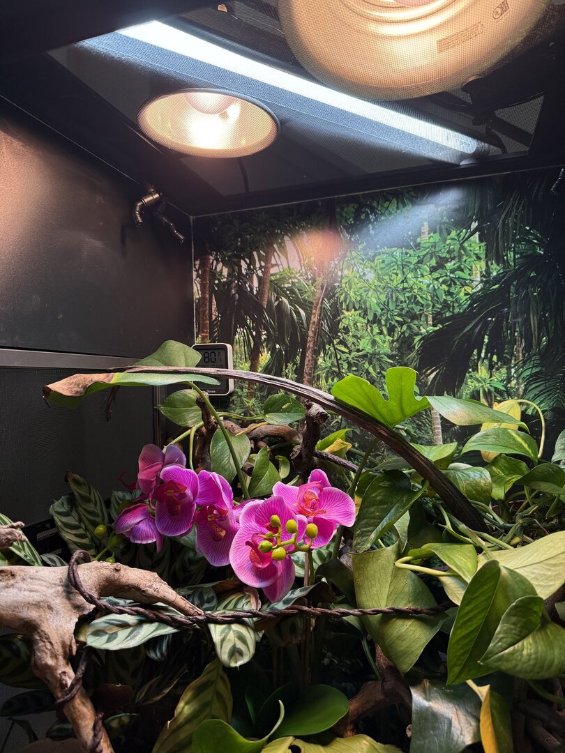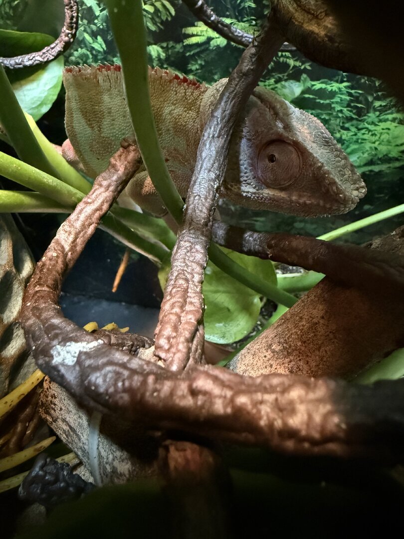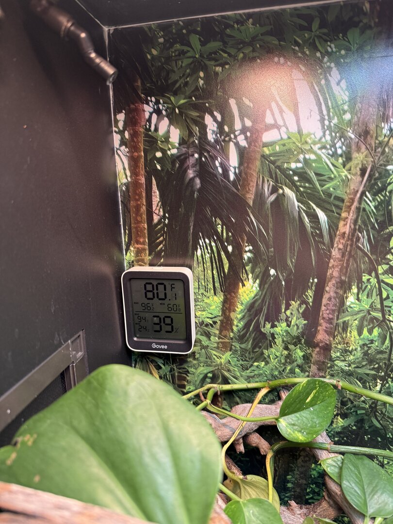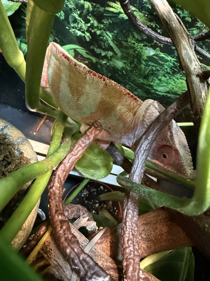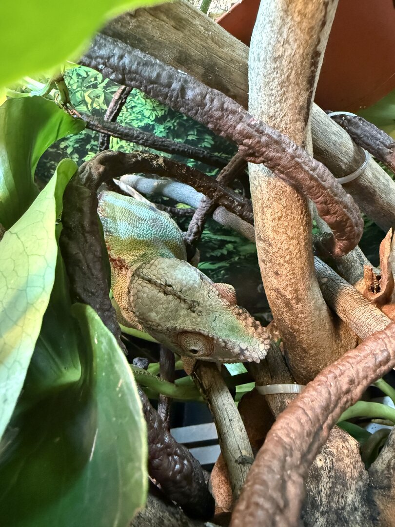 Over the past few weeks I’ve noticed that my male panther doesn’t want to bask for some reason, which then makes him too cold (dark colors). He’s still eating but I can tell he’s not 100%. Pictures attached of the ambient temp, basking branch, and him hiding in the plants. The ambient temp is around 80F but when I use a heat gun, the actually branch is closer to the recommended 90F.