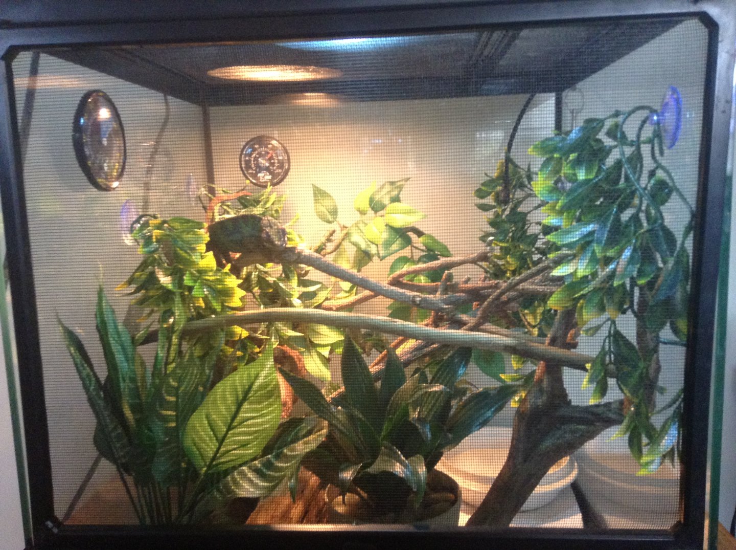 ). That's what he's like during the morning up to the late afternoon/evening (so like 4pm/5pm). By then, that's when he starts winding down. Although, he will take a break and rest in between his "climbing adventures" throughout the day. Usually after my mom and i feed him, he rests for awhile. Then he's on the move again, hehe. Throughout the day, he switches back and forth from his basking spot to a cooler spot. Closer to 7pm, or as my mom and i call it, "nighty-night time", New-New gets more tired and sleepy. My mom drains his bowl that catches the drip frequently throughout the day, but definitely when it's nighty-night for New-New so the bowl doesn't overflow in the middle of the night. Once lights go out, New-New picks a nighty-night spot (which is usually always different, depending on where he feels like sleeping).