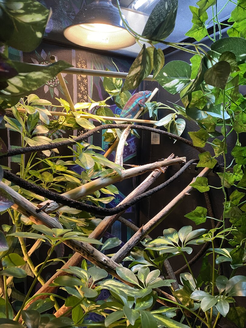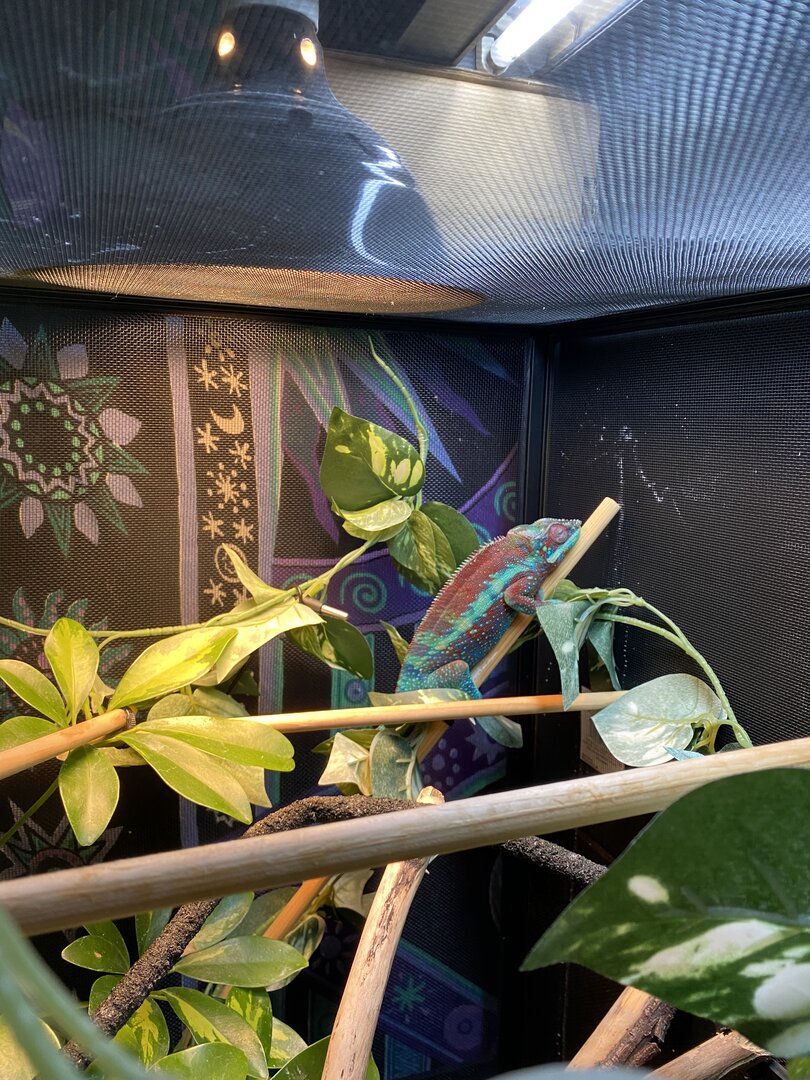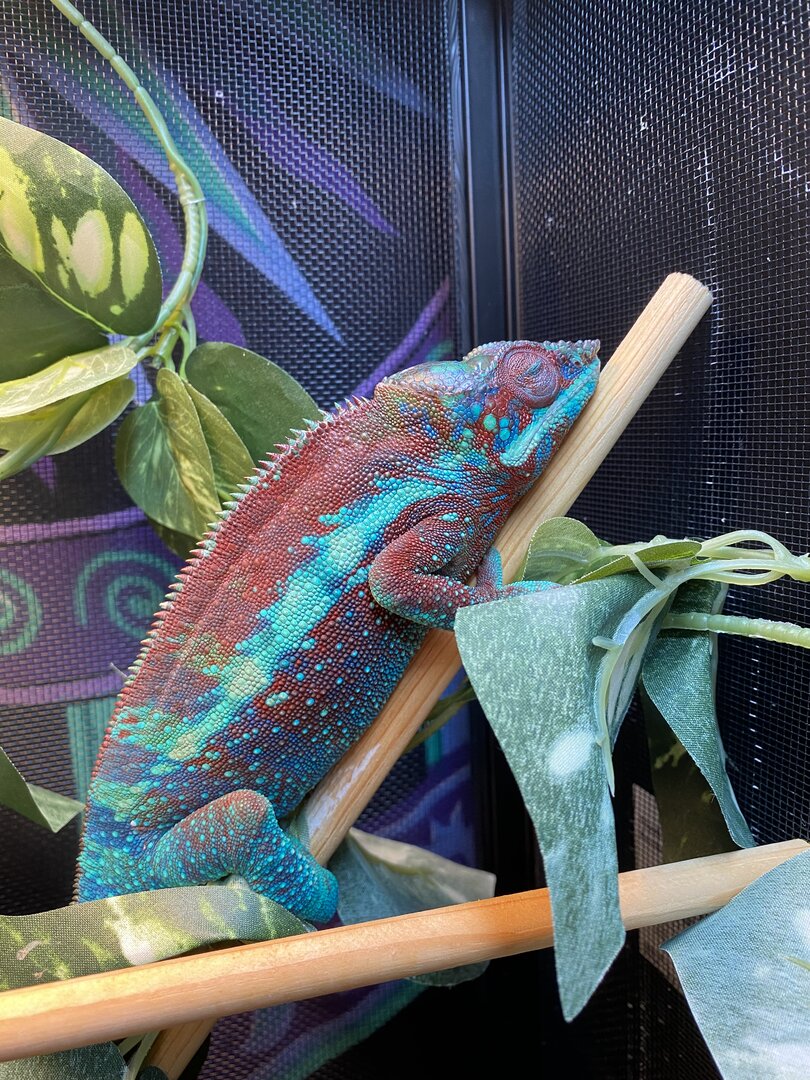 My 1-year-old Ambanja Panther chameleon completely stopped doing his normal life and routine randomly about 1 month ago and started shutting his eyes during the day. As recommended people always say go to the vet if your chameleon is shutting his eyes a lot during the day so I did. the vet washed out his eyes and gave me some antibacterial injections that I gave him for a week or so with no improvement. I then went back and asked them to do a blood test and they said that they couldn't get blood out from him and it was then I realized this vet definitely has lied about knowing anything about chameleons. After that Vet visit I did a lot of research and then found a very good reptile vet about an hour away from me. they were able to do blood tests and a kidney/liver panel of some sort and said that they found no infections but that his calcium levels were low. which is weird because before he got sick I followed a very good dusting schedule. The vet then prescribed me an oral calcium gluco of some sort that I have been giving him once a day for the past week as well as they gave me a powder food formula to feed him three times a week to help with his nutrition as he has not eaten or drink on his own in 3 weeks. I have been doing everything for him and the only time he opens his eyes is when I bother him.
