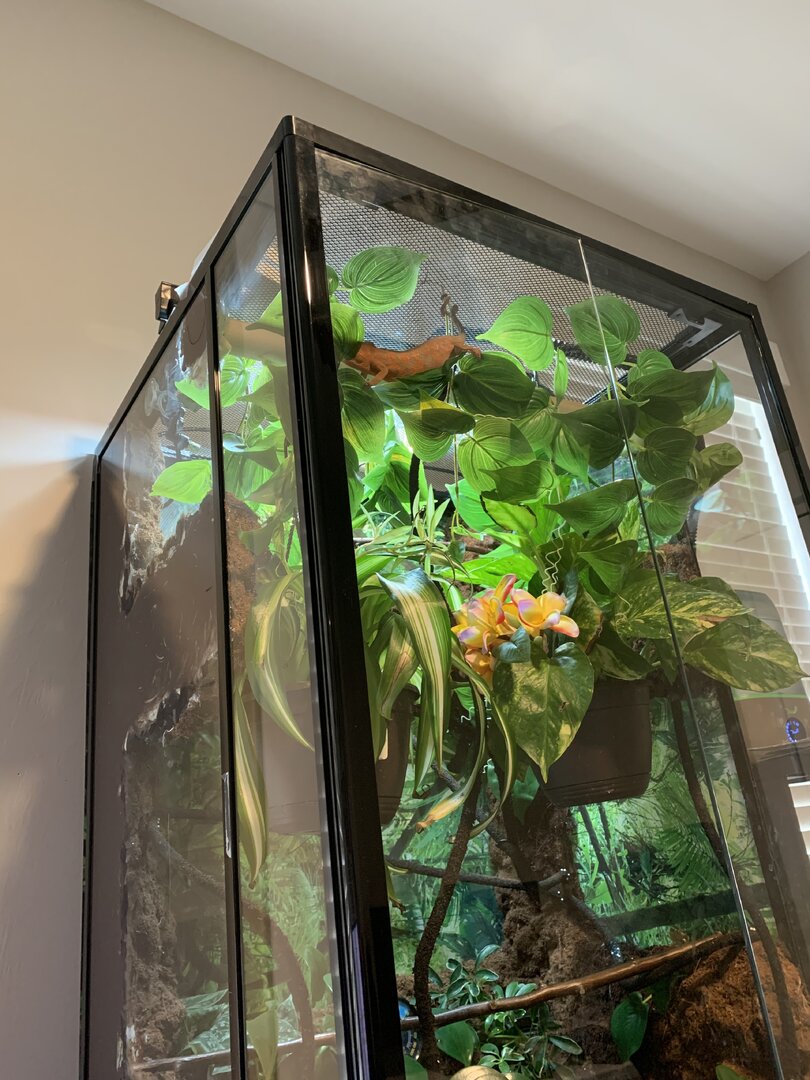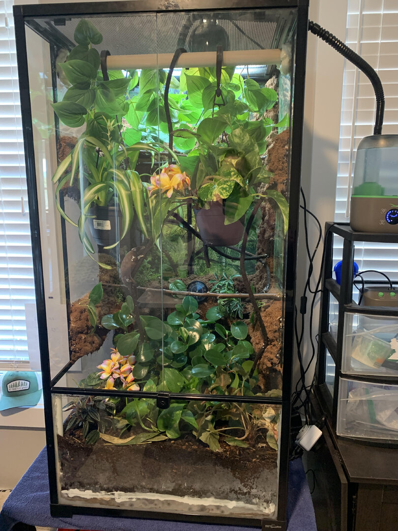 - Cage Type - Hybrid mostly glass cage, I live in a very dry environment. 2x2x4, the screen is only on the top. Bioactive with leap soil on the bottom for the plants and a drainage layer with ceramic balls. Just got it all put together, isopods and springtails are on the way.