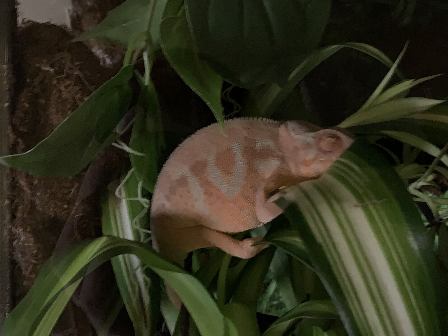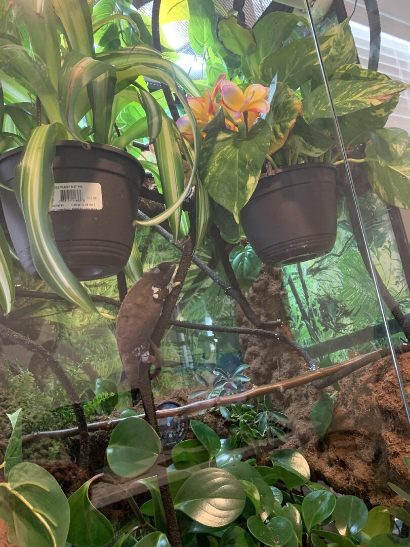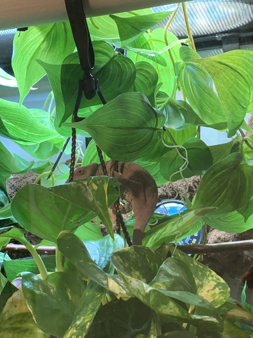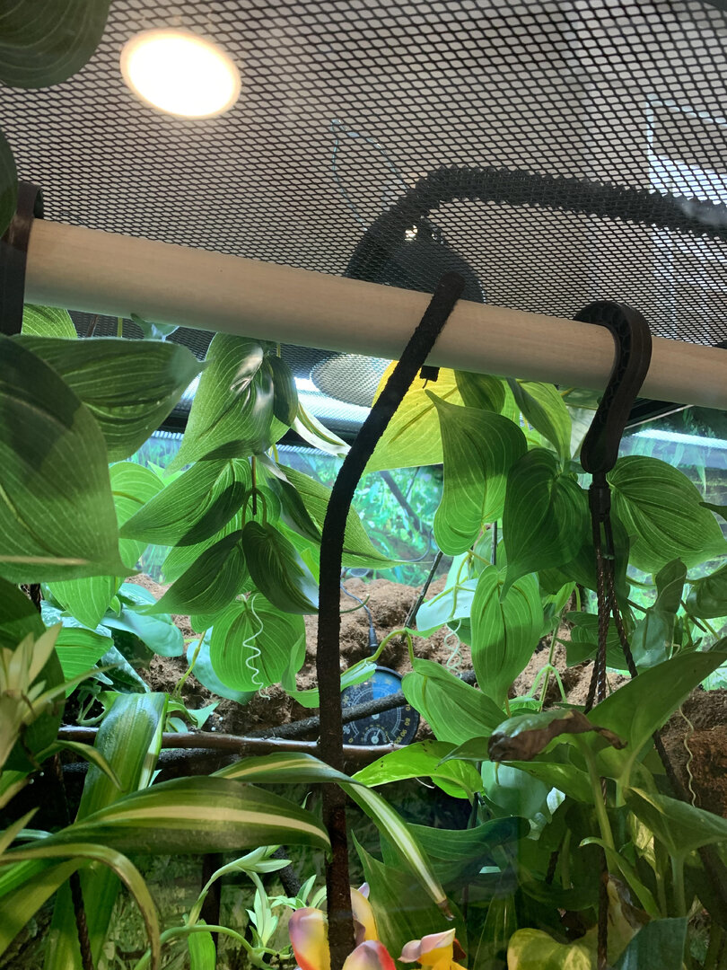 My concern is that she always hangs out on a vine below the hanging plants and is brown. She lightens up to pink when she eats, and usually in the late afternoon she'll move up to the basking area, but otherwise she doesn't use it at all. I have a probe thermometer so I know it isn't too hot up there. I just don't know what I'm doing wrong and I'm sad she's unhappy.