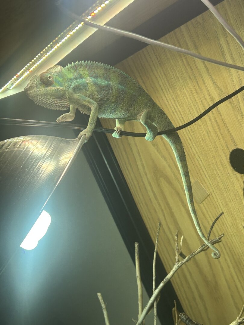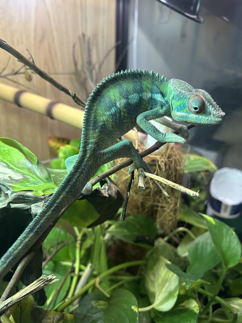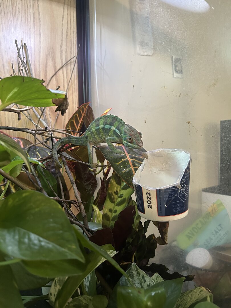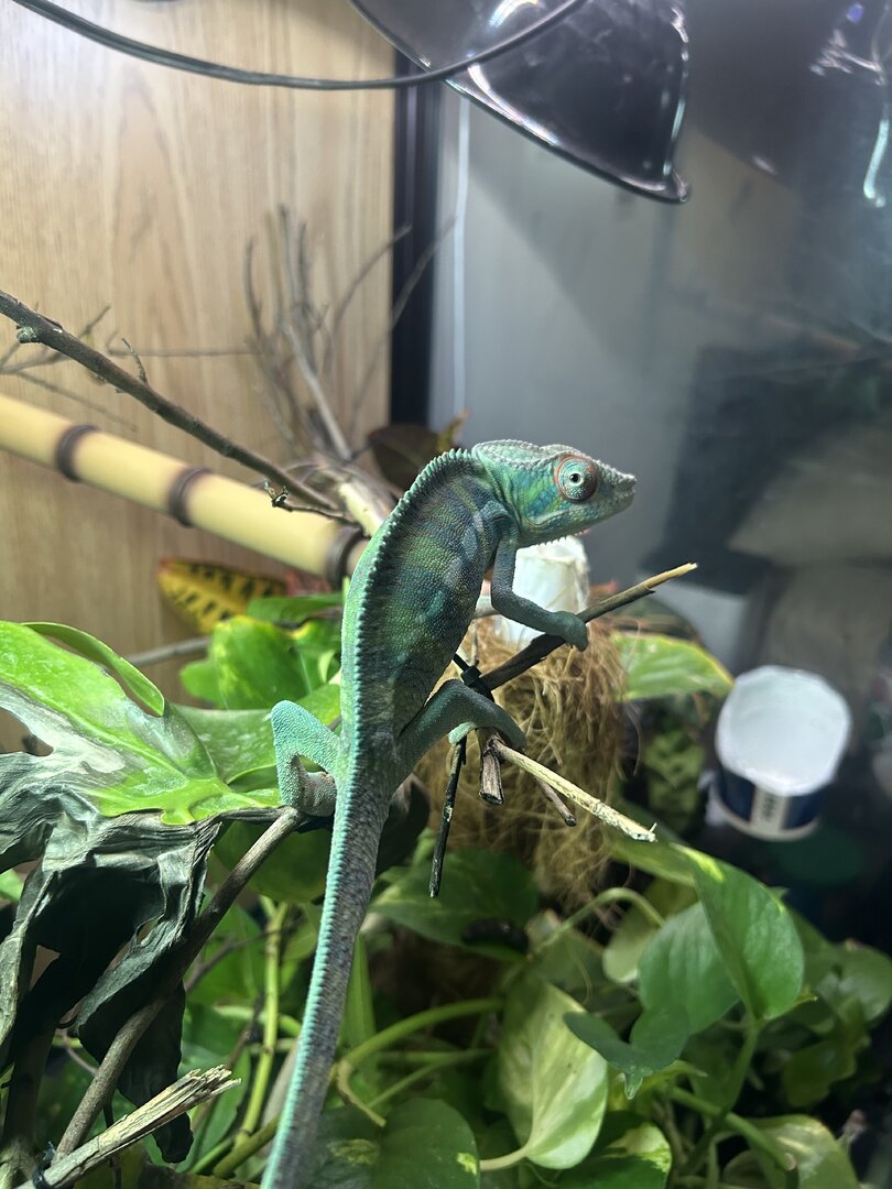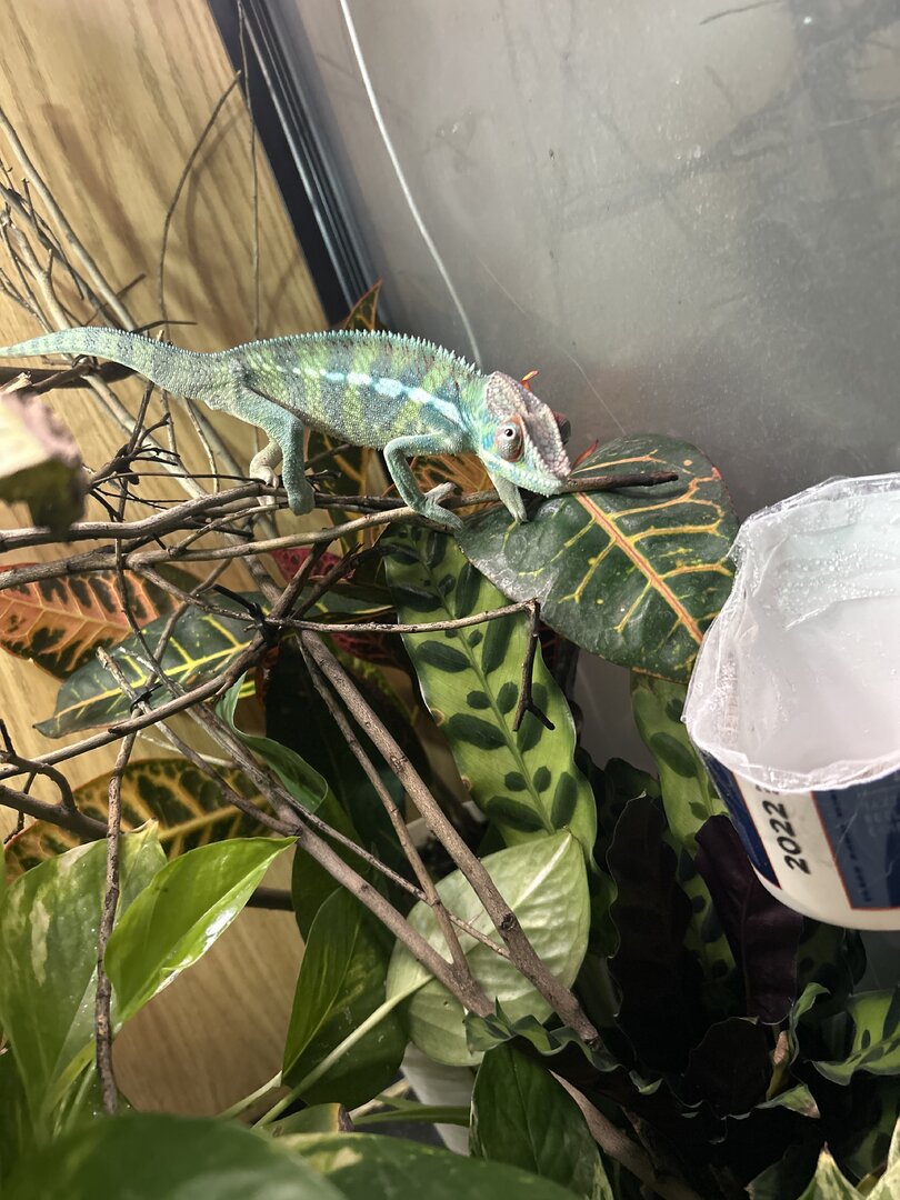 As promised here is a week’s progression: Pascal has been eating way more everyday. He’s been on a dubia roach, superworm, and hornworm diet eating about 4-8 everyday as he pleases. He couldn’t eat twelve, but it’s a significant increase to what he’s used to. I ordered some waxworms and silkworms as well, should be here in a couple days.He is super active so I’m ruling the parasites out as well. I’m going ASAP to buy some in the morning because he already ate 4 significantly large dubias today. Seeing those Chameleons really puts into perspective how much he should be eating. His more vivid colors only started coming out maybe 1 or 2 months ago.
