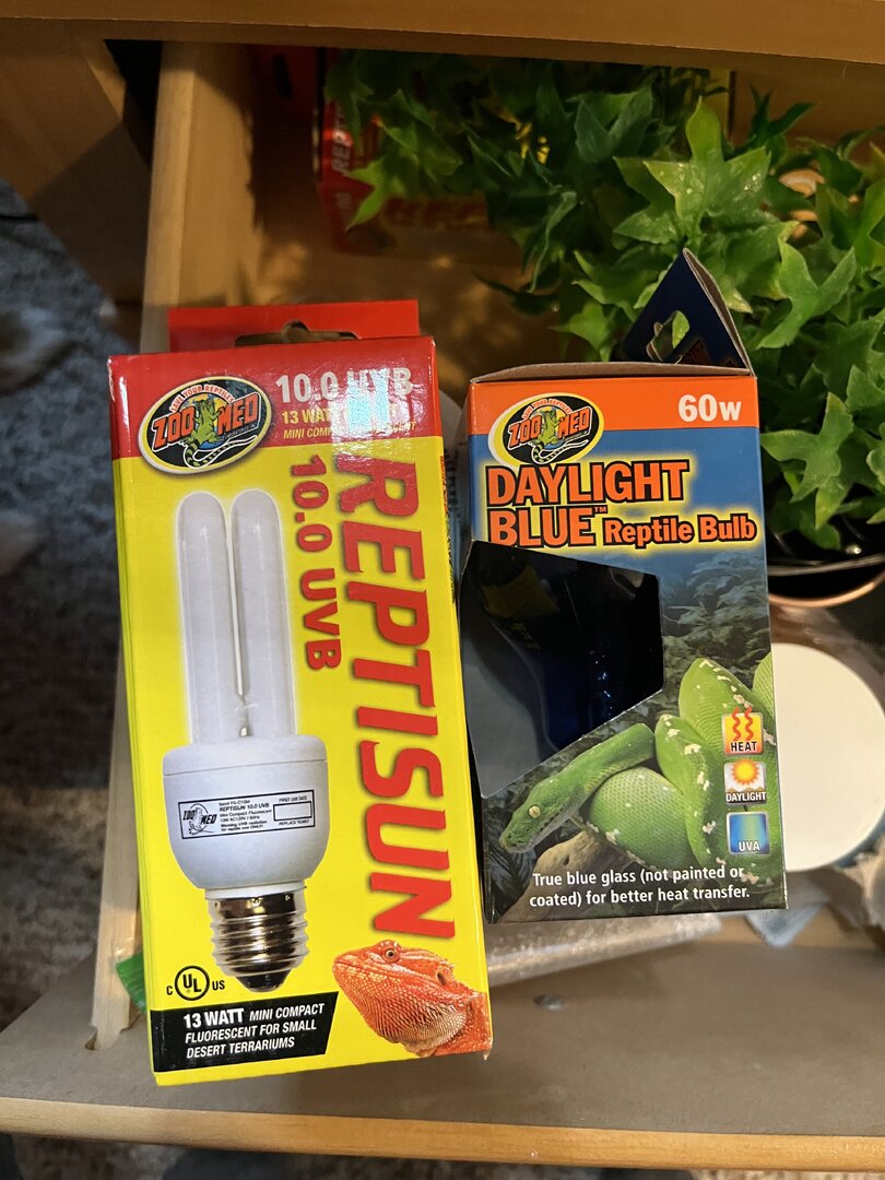 The blue light - what is that for? Basking? You don't want any of those color lights in their enclosure, it can hurt their eyes. If you need a basking light you can actually use the bulbs we use in our house. Here is a video on what to use.