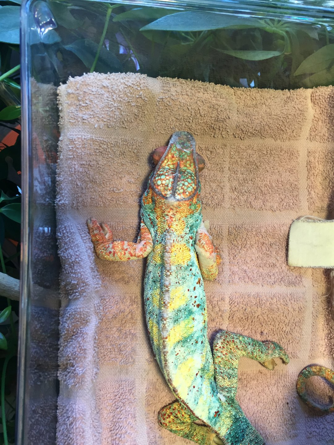 I have a 3 year old Panther Chameleon, about a week ago he choked on a worm and was laying at the bottom of the cage. My husband was able to get the worm out of his mouth, he acted weird the next couple of days.